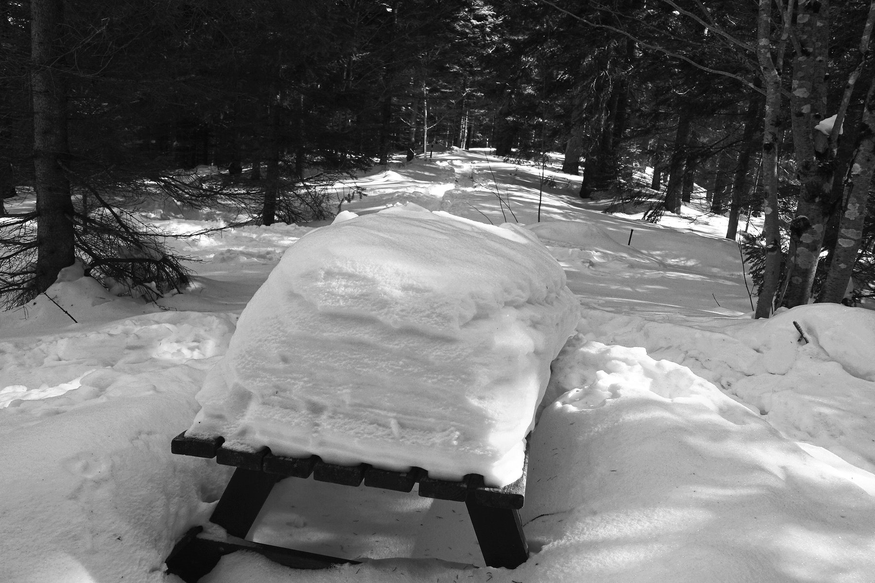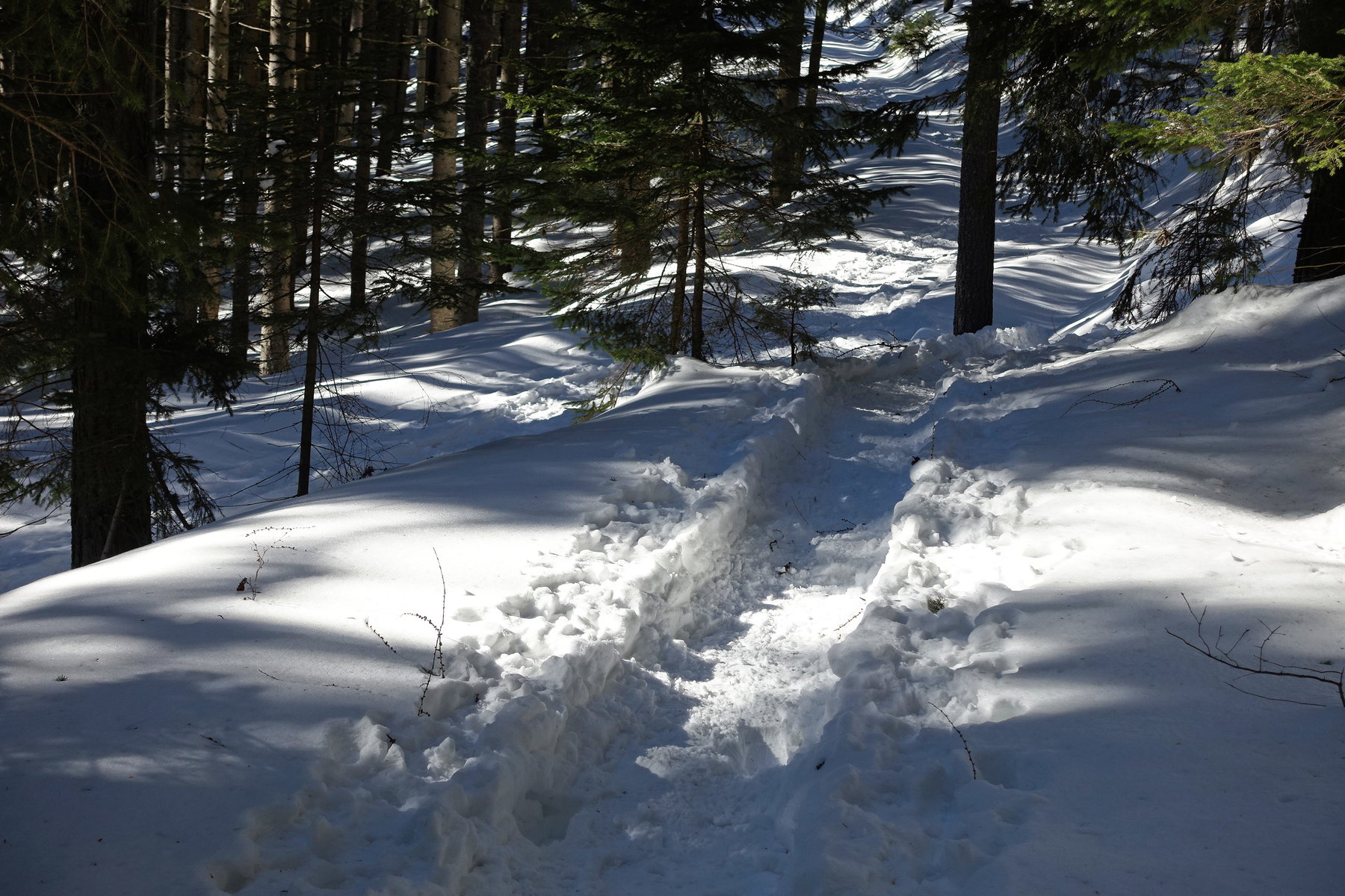 Dort zweigt links der Wanderweg Richtung Kampalpe ab, mit einigen Ausblicken in beide Richtungen. Anfang 2023 war hier ungewohnt viel Schnee.
