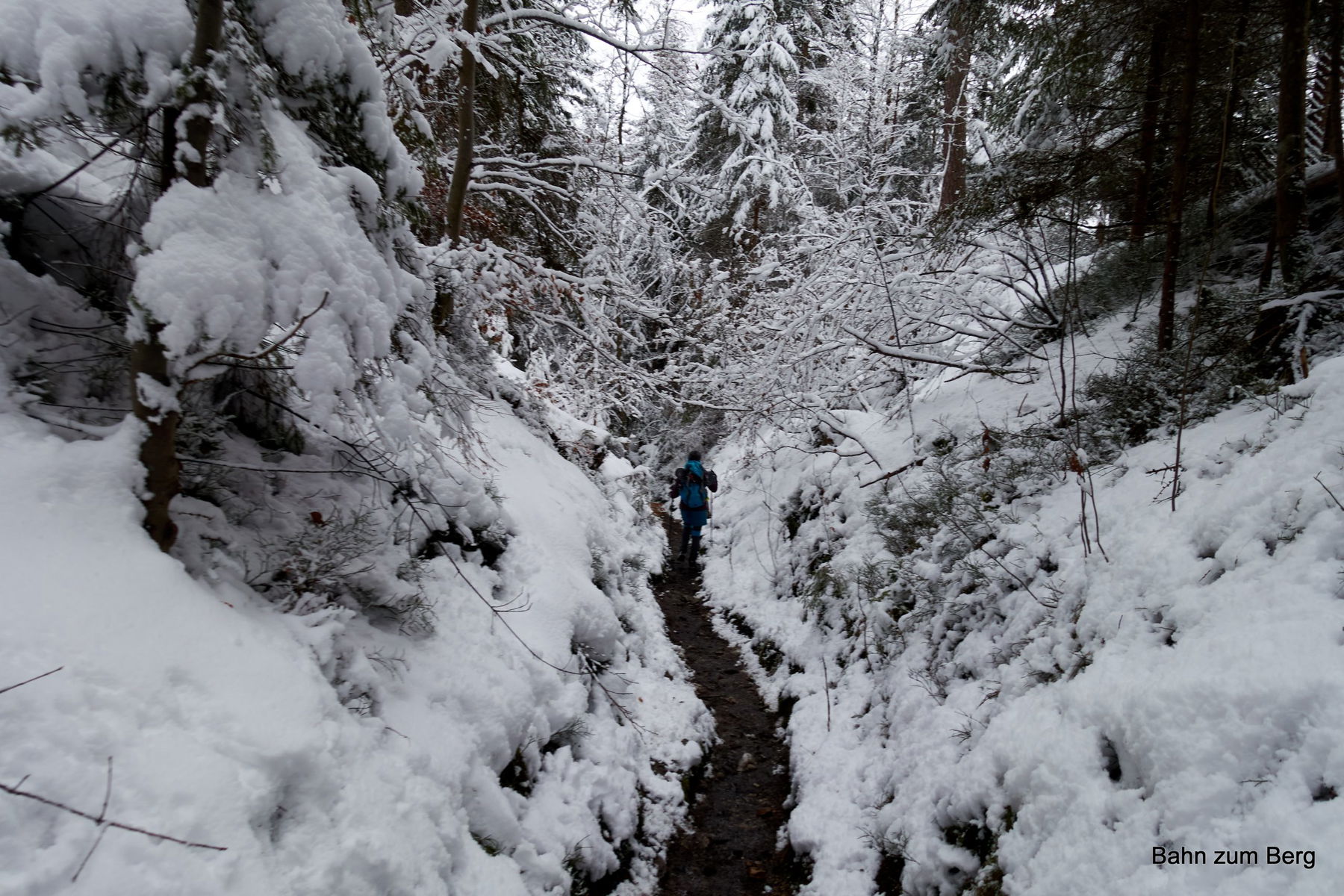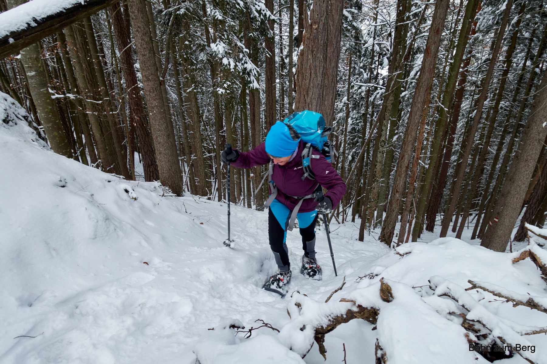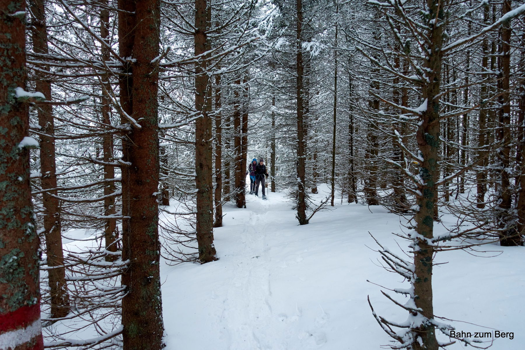 Der Aufstieg kreuzt zwei Mal die Schotterstraße, bevor wir endgültig im Wald unterwegs sind. Es hat in der Nacht frisch geschneit. Trotzdem ist der Weg einfach zu finden: Erstens weil gut markiert und zweitens weil schon wer vor uns hier gegangen ist.