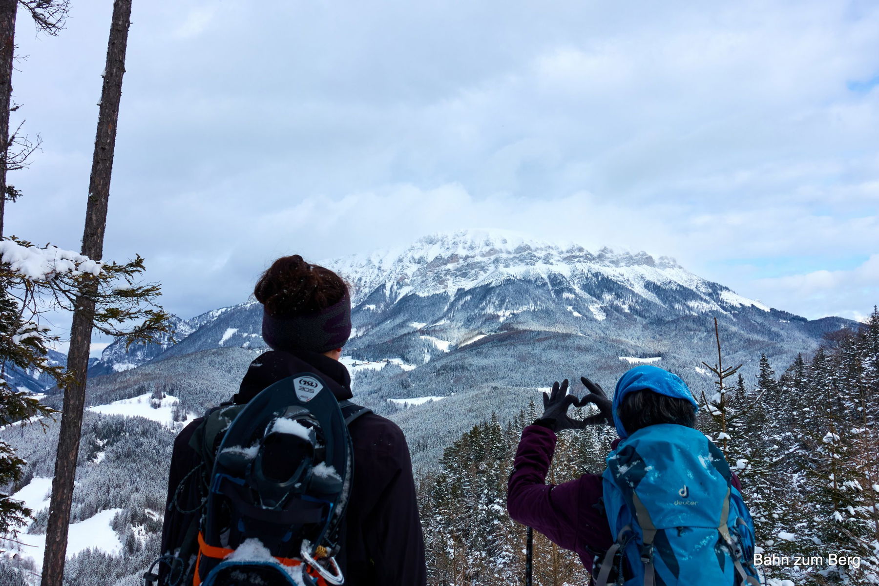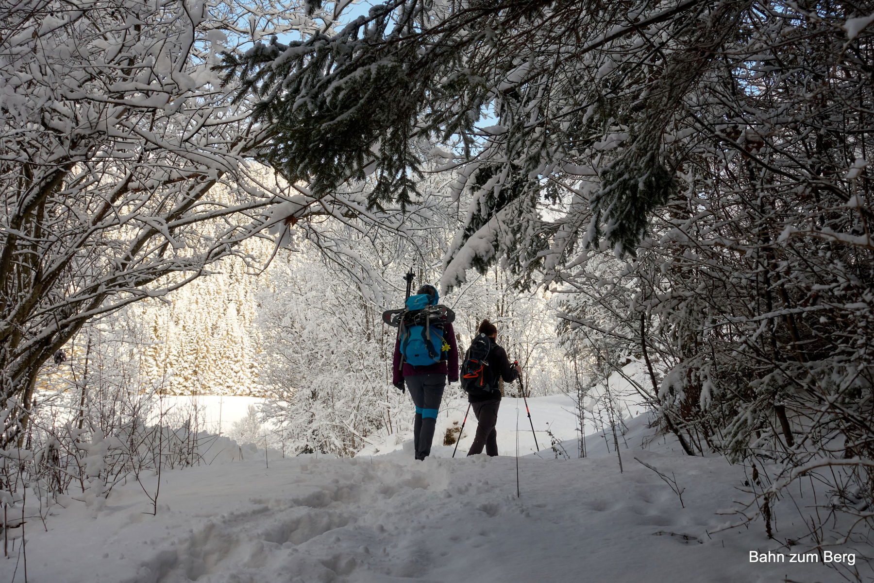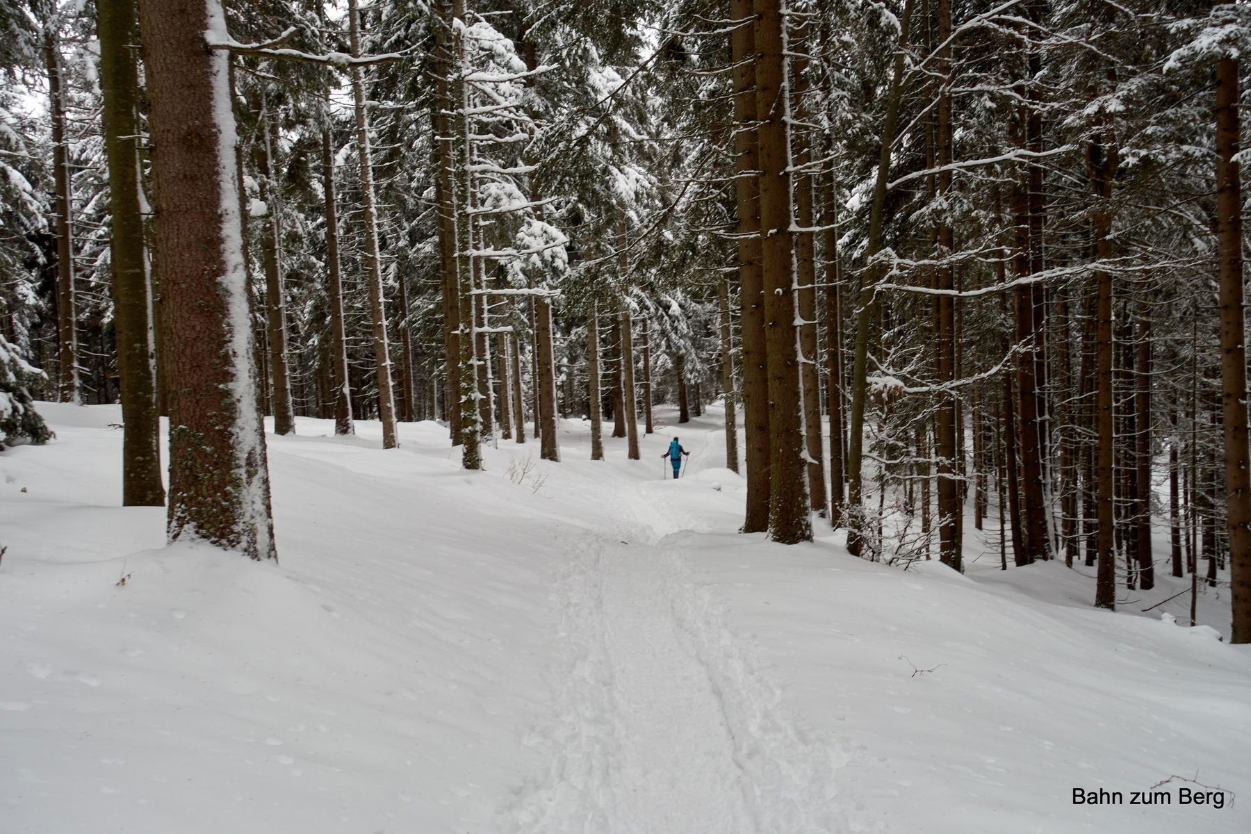 Der Aufstieg kreuzt zwei Mal die Schotterstraße, bevor wir endgültig im Wald unterwegs sind. Es hat in der Nacht frisch geschneit. Trotzdem ist der Weg einfach zu finden: Erstens weil gut markiert und zweitens weil schon wer vor uns hier gegangen ist.