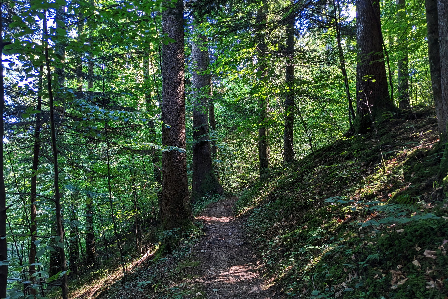Zum Schluss führt uns der Wanderweg weiter den Hang entlang. Die Geräusche werden mehr, Stimmen, Gelächter und Tritte. Nicht mehr weit zur Theklankapelle. Fotos: Thomas Obermair