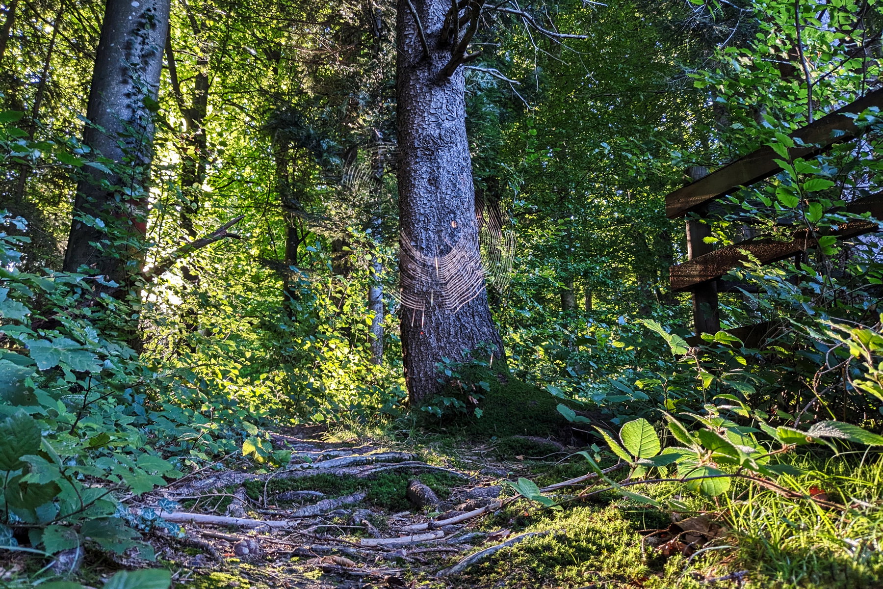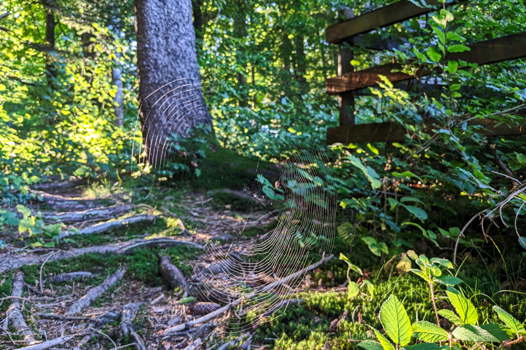 Achtung Stolperfalle! Mit einem Hopser überwinden wir das frech gebaute Spinnennetz. Das kleine Tier hat allerdings wirklich saubere Arbeit geleistet, Gratulation! Fotos: Thomas Obermair