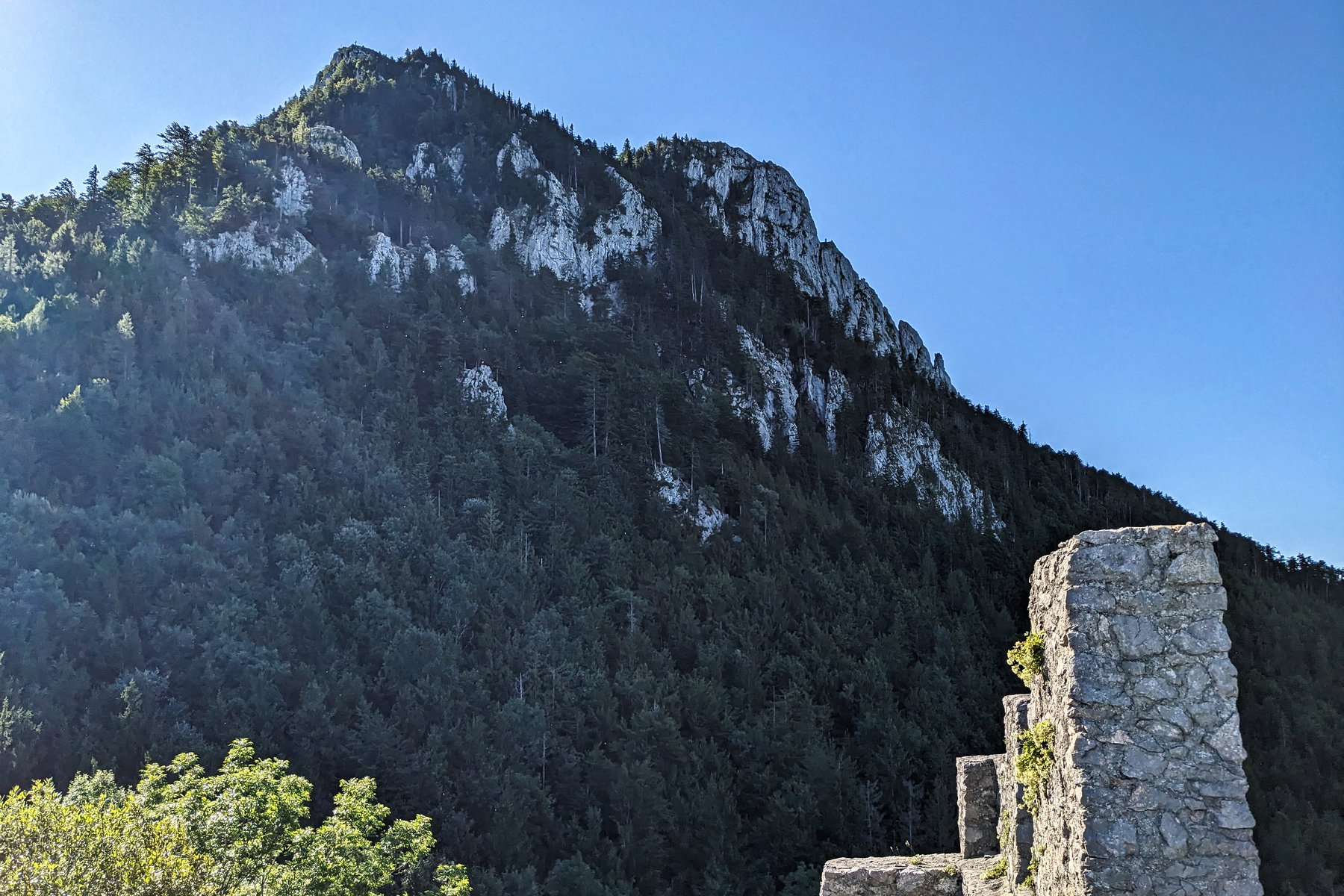 Zuerst versteckt sich die Burgruine hinter dichtem Wald, doch sie erhebt sich über die Baumkronen und gibt den Blick auf den Felsstock des Schobers frei. Fotos: Thomas Obermair