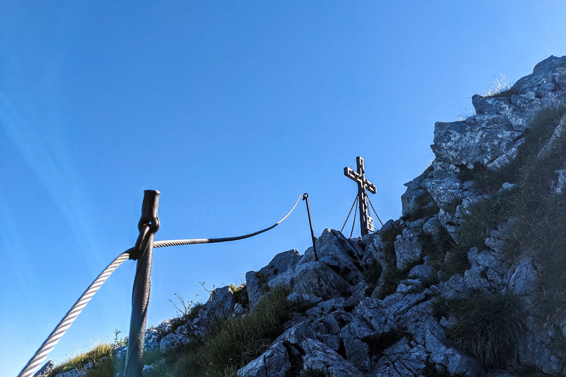 Ein Rundum-Erlebnis ist es auch, weil wir mit dem Abstieg den gesamten Felsstock umrunden, dabei nehmen wir sogar noch einen Gipfel mit! Bei der kleinen Schutzhütte steigen wir ein paar Meter vom Hauptgipfel ab und folgen dem schmalen Pfad zum Frauenkopf. Der Ausblick ist nicht minder schön, es ist allerdings etwas weniger Platz.