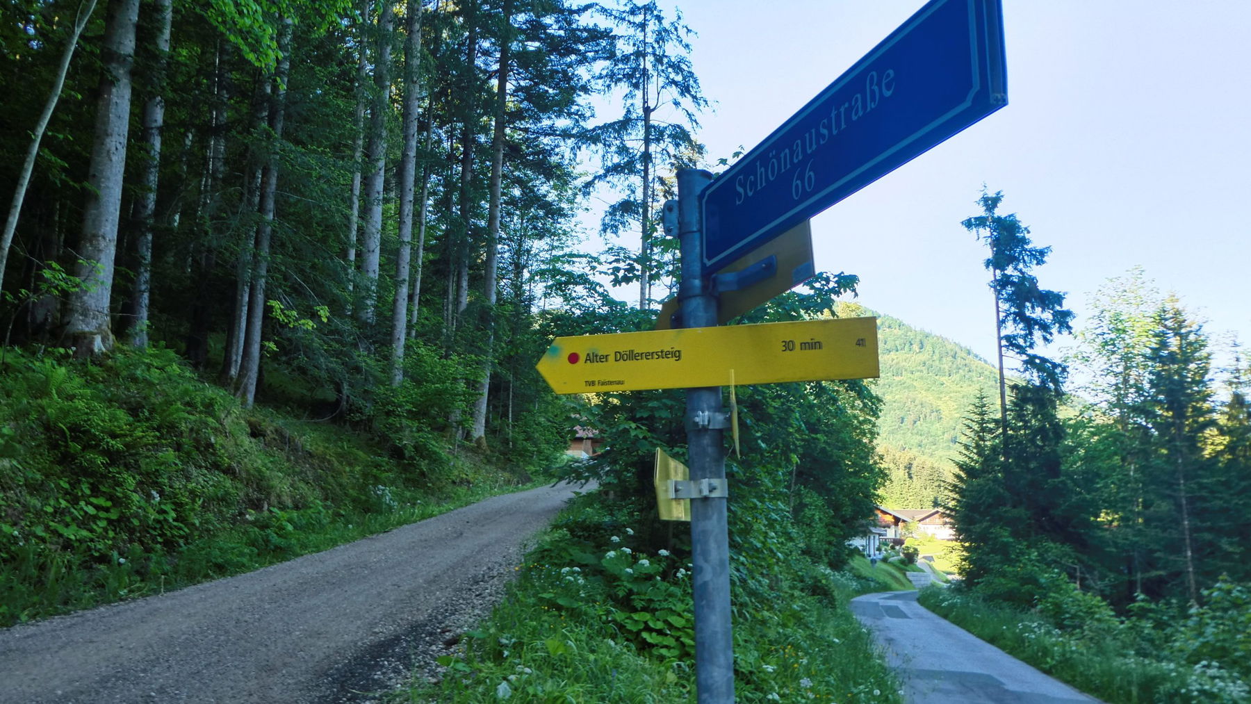 Der erste Einstieg ist schnell gefunden: Gelbes Schild: Alter Döllerersteig. (Wenn die Station „Schönau“ nicht angefahren wird, steigt man beim „Kindergarten“ aus und ist – allerdings über Asphalt – in wenigen Minuten beim Einstieg.)