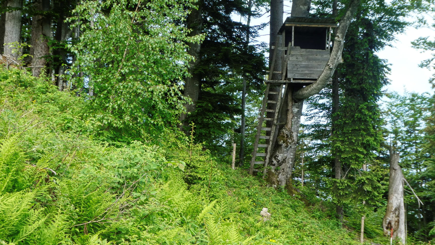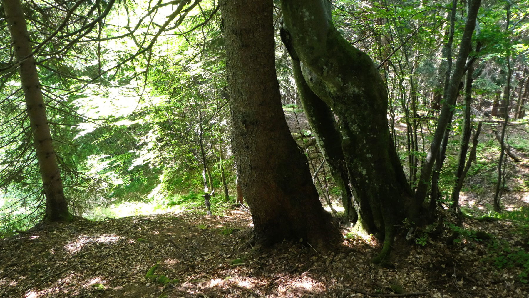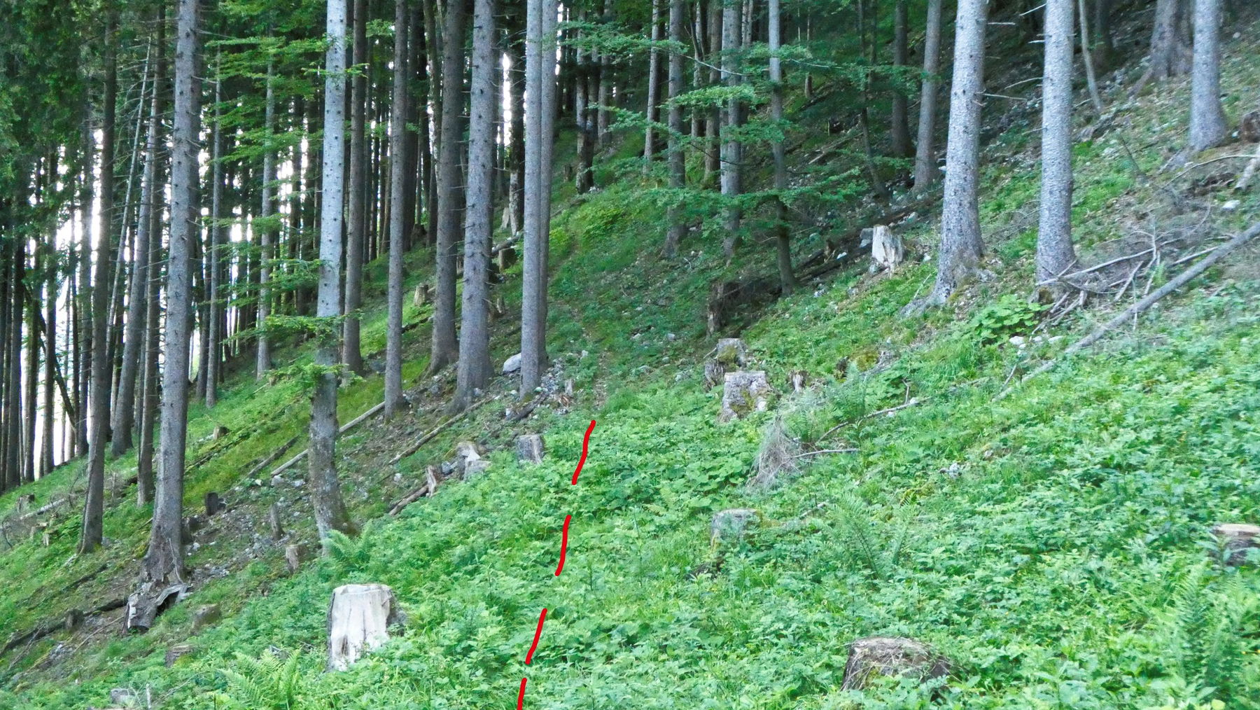 Durch Wald ziehen die Traktorspuren bergan, dann erreichen sie den Rand einer große Wiese. Man braucht diese nicht betreten, sondern folgt der von links kommenden Forststraße im Wald für ca. 60 Höhenmeter aufwärts. Nach einer Rechtsschleife nimmt man aufmerksam den Wald zur Linken in den Blick und findet – jenseits des kleinen Schlages, im Hochwald (Einstieg Nr. 2) einen schönen Steig, der in der ÖK punktiert eingezeichnet ist. Diesem Steig folgt man.