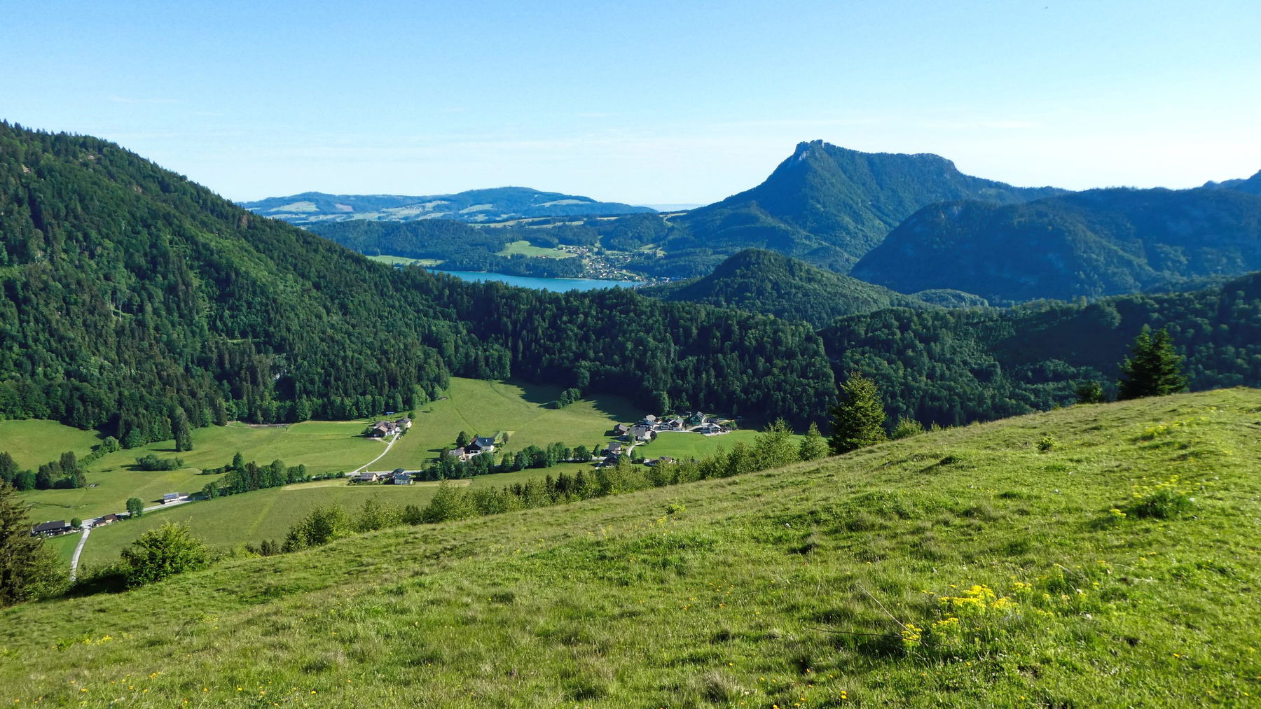 So ist es auch! Nun ist also die Straße erreicht, die nur mehr zu queren ist: Der Einstieg Nr. 4 zum Pfad, der über den immer wieder von Wiesen und Lichtungen durchsetzten, prächtigen Nordrücken zum Gipfel des Faistenauer Schafberg leitet, eine besonders schöne Etappe, ist gefunden. (Diesen Tipp – auf keiner Landkarte zu finden, verdanke ich: Faistenauer Schafberg Überschreitung+Rannberg • Bergtour » outdooractive.com)