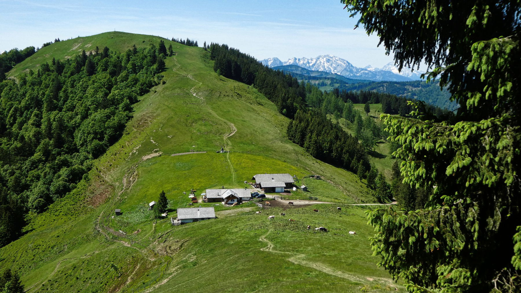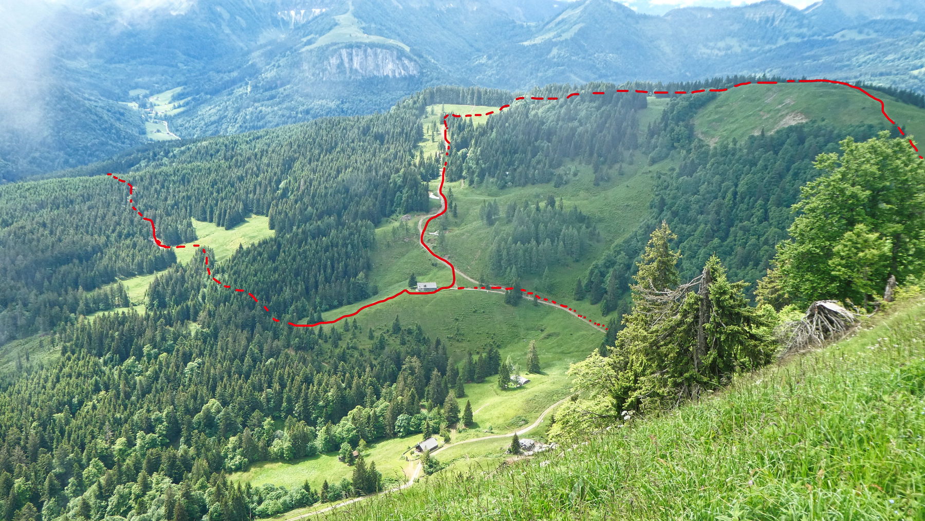 Bald erreicht man eine Alm. Da der Wiesenweg (von viel zu schweren Kühen?) und dem Gewitter des Vortags sumpfig ist, entscheide ich, diesseits des Zaunes für circa 30 Höhenmeter – weglos – im gut gangbaren Hochwald zu bleiben. An geeigneter Stelle steige ich über den Zaun. Die nächste Etappe führt über eine weite Kuhweide.
