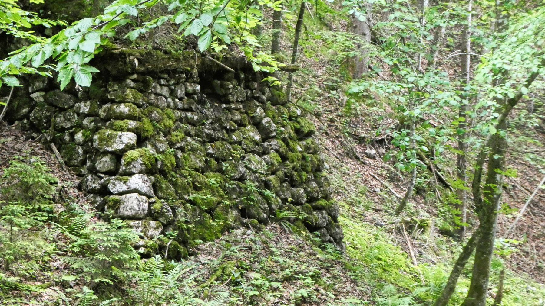 Allerdings: Ausgetreten ist anders – aber ich wollte ja eine stille Überschreitung finden. Durch Hochwald und einen Schlag geht es über einen Wasserlauf in den Leitengraben. Schließlich quert der Weg die markierte Forststraße. Ab hier lässt er nichts mehr zu wünschen übrig! Wie staune ich über den Brückenkopf, den frühere Generationen für das Bauwerk, das den Leitengrabenbach bändigen sollte, gestaltet haben!