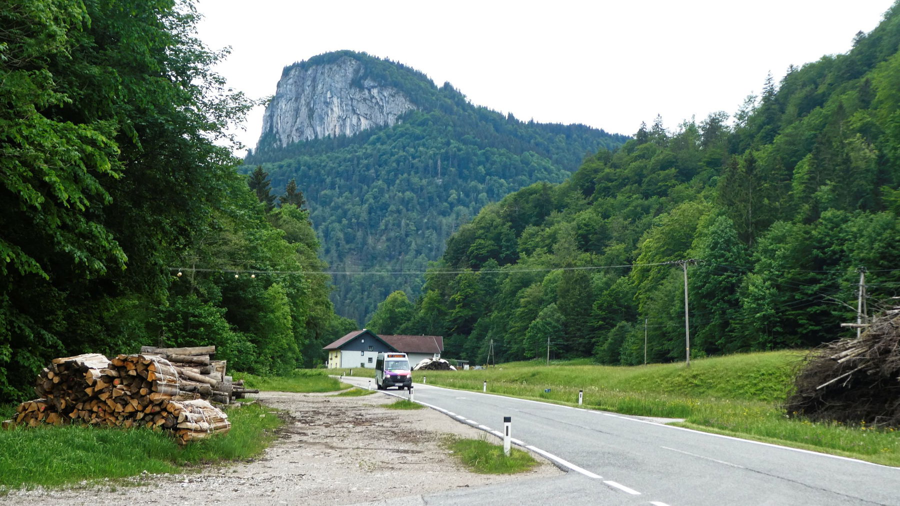 In Hof steigen die Schulkinder aus, der Bus 155, der um 6:27 Uhr vom Salzburger Hbf abfährt, leert sich. Im Faistenau setzte ich mich zum Fahrer vor und plaudere ein wenig mit ihm. „Das ist die Station Schönau“ – sagt er, bleibt auf der einspurigen Straße stehen und lässt mich aussteigen.