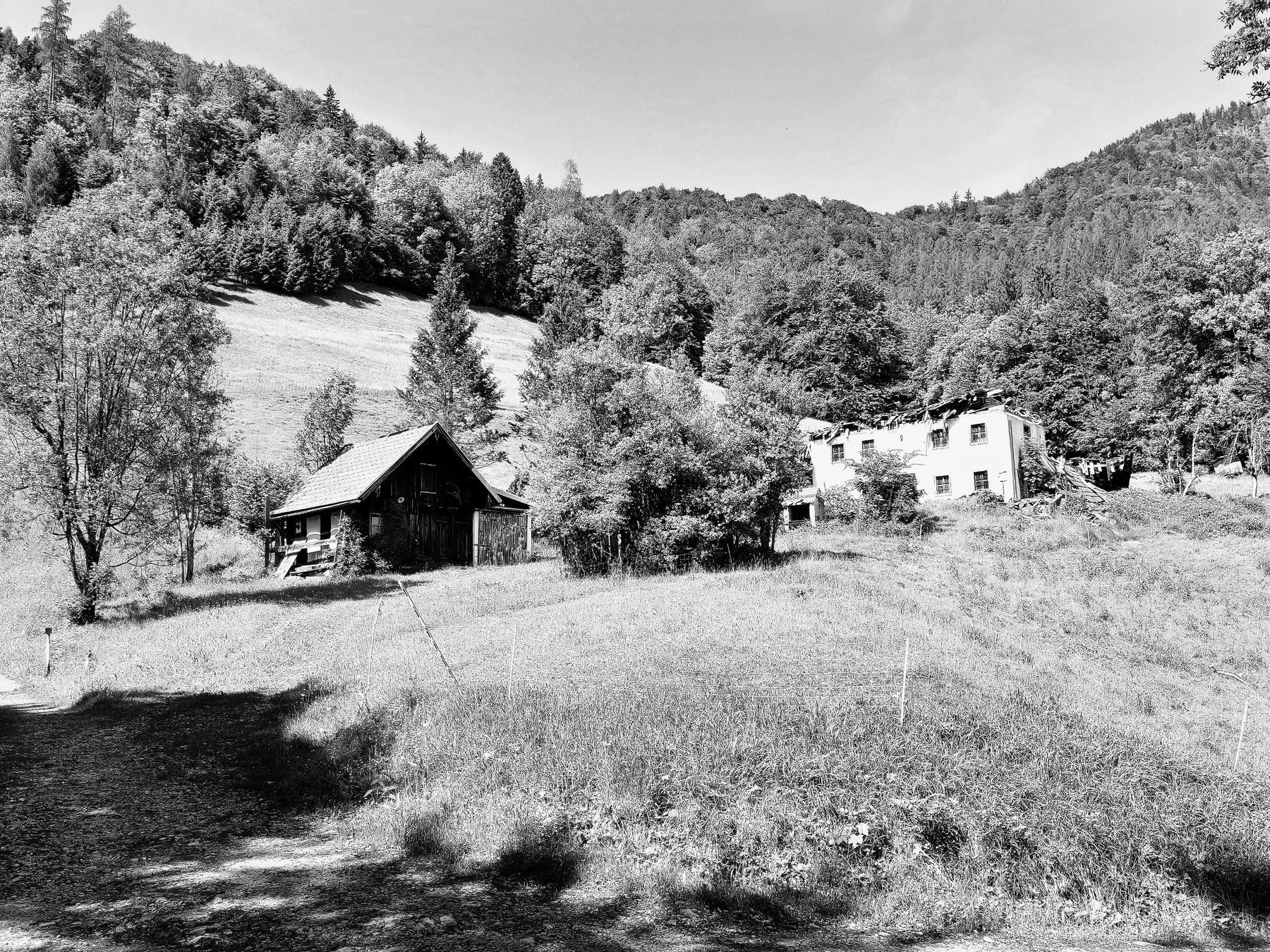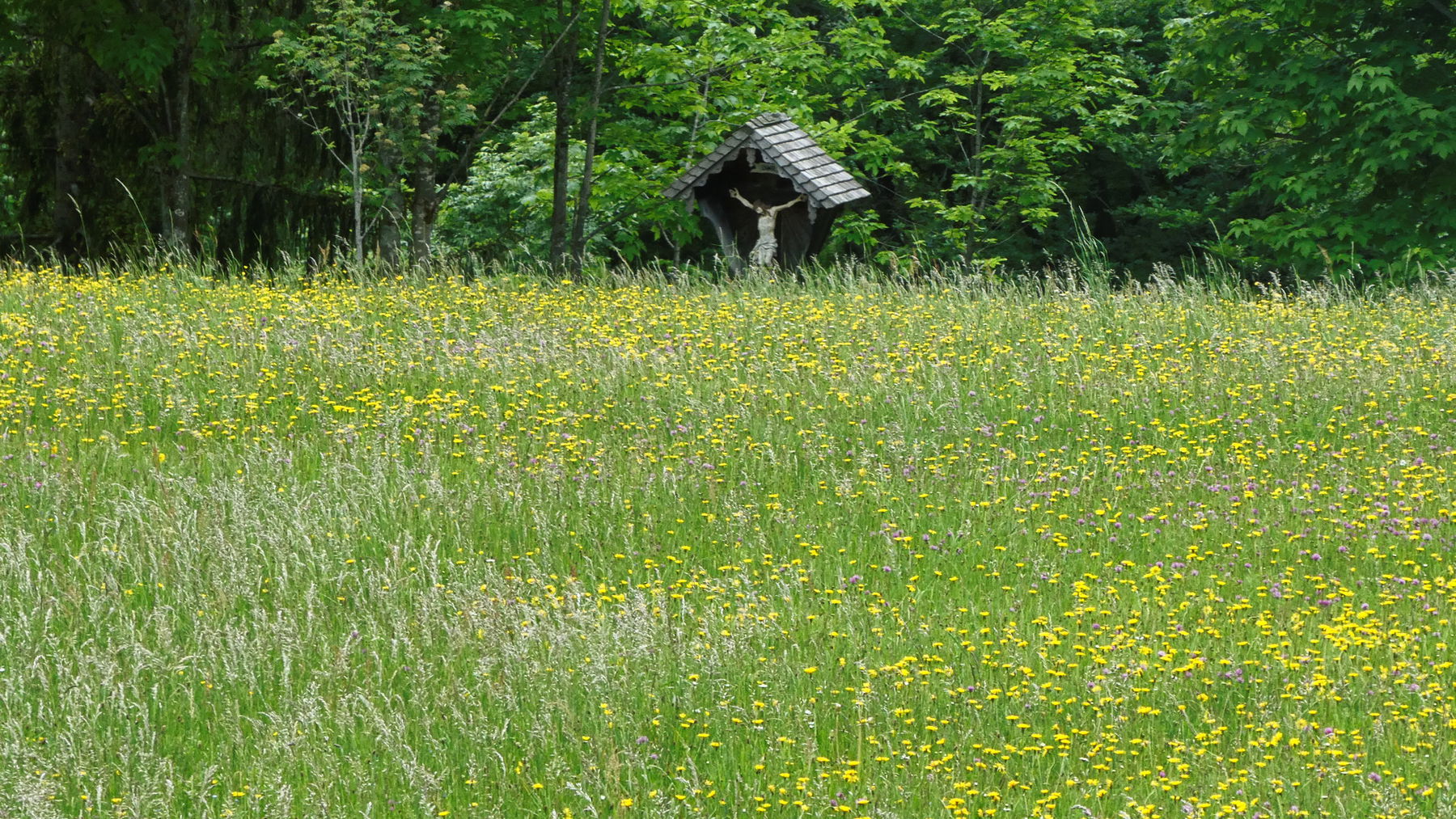 Für die nächste Etappe genügt eine kursorische Beschreibung: Nach der Häusergruppe Sendlberg führt ein Weglein am Wiesenrand entlang in den Wald. Bald erreicht man eine weitere schöne Wiese: Hier, beim abgebrannten Gehöft (der Brunnen vor dem Haus spendet noch Wasser!), sagen sich Fuchs und Hase: Gute Nacht!