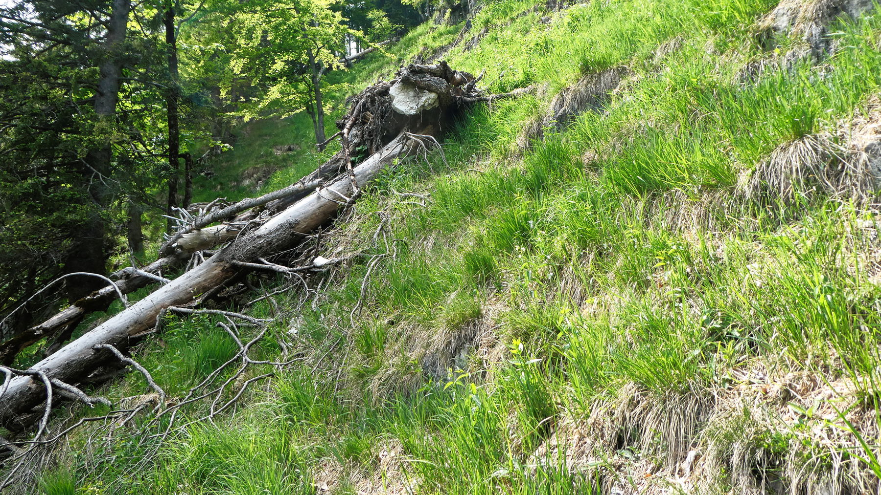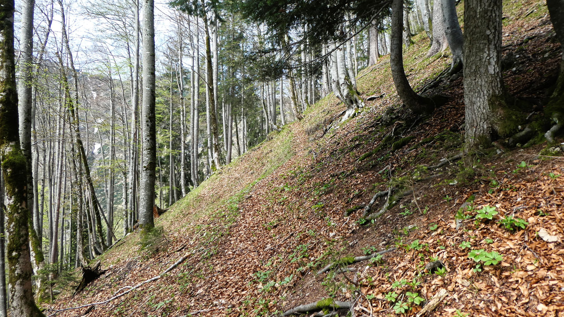 Der Wilderer meint, nun das Ärgste hinter sich zu haben… Nicht ganz! Er folgt den Steigspuren im Buchenlaub, die waagrecht unter dem Gipfel des Seeberghorns queren. Auch dieser Pfad war einst wohl gut ausgetreten. Das Gelände wird steiler, der Weg führt bergab. Wegen des langen Grases habe ich die Snowline-Grödel an die Schuhe geschnallt. Leider zerstören drei oder vier entwurzelte Bäume den Pfad und nötigen zu Kraxeleien. Das muss der Wilderer eben in Kauf nehmen…