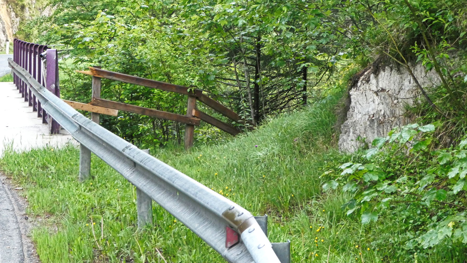 Doch: Gibt es aus diesem Kessel ein Entkommen? Für den Wilderer schon, allerdings im weglosen „Zick-Zack“ (daher die detaillierte Beschreibung; im steilen Tobel ergibt der GPX-Track einen Knäuel): Man überquert an geeigneter Stelle den Bach (Achtung: nasse Steine sind überaus glitschig – ein Stock tut hier gute Dienste!), folgt dem Ufer, bis die seitlich hereindrängenden Felsen erneut eine Querung auf die andere Seite erzwingen, stapft am flachen Ufer talauswärts und – man hat schön Übung – balanciert erneut hinüber. Nun hält man sich am besten auf der Rippe eines tief ausgewaschenen Wasserlaufs. Steinmännchen und Steigspuren, die möglichst im Hochwald bleiben, um dem Gestrüpp zu entfliehen, mögen dem Wilderer den Weg weisen; eine Linksquerung oberhalb des Gestrüpps in den Hochwald hinüber, ein letztes Steilstück über die Böschung – die Asphaltstraße ist erreicht (circa ½ Stunde).