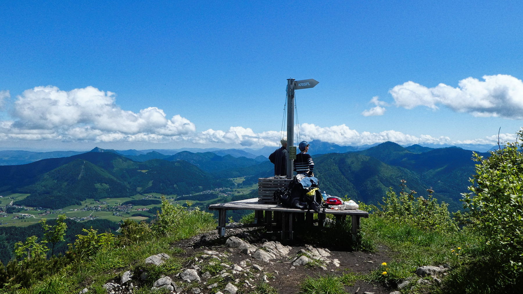 – vor den erstaunten Augen der auf der Gipfelbank Rastenden – das Kreuz des Ochsenbergs, dem ersten der drei Gipfel der Überschreitung. Bis hierher insgesamt circa 2-2 ½ Stunden.