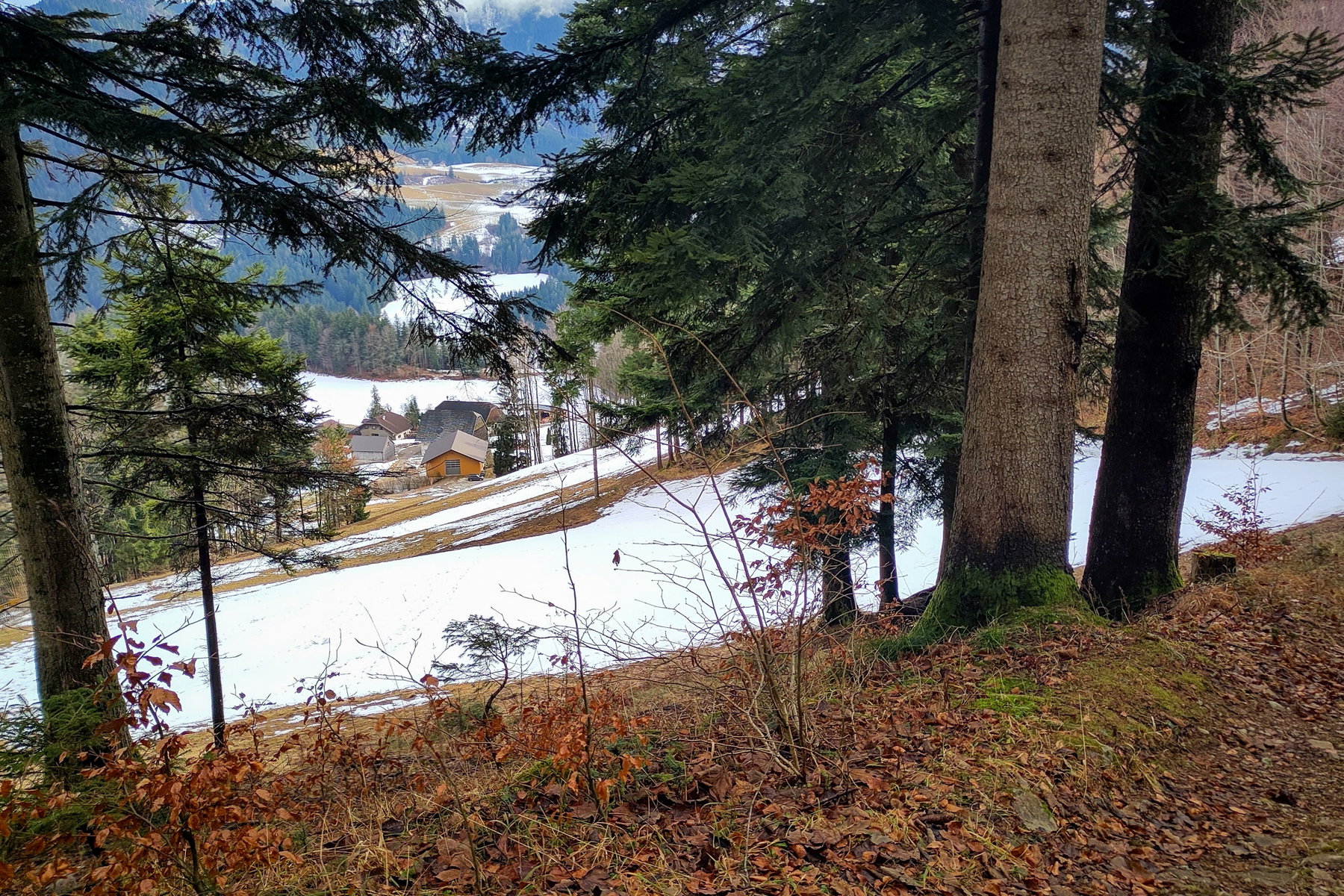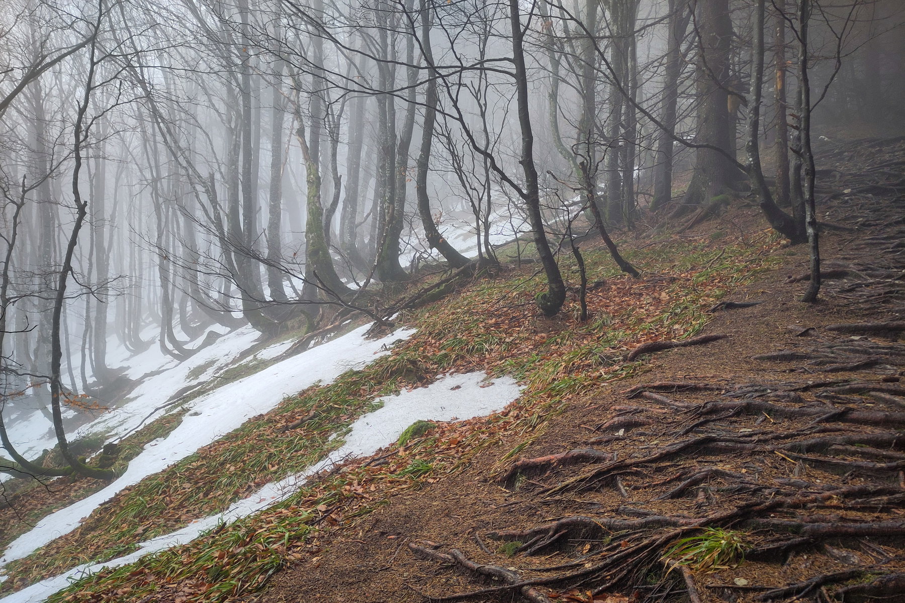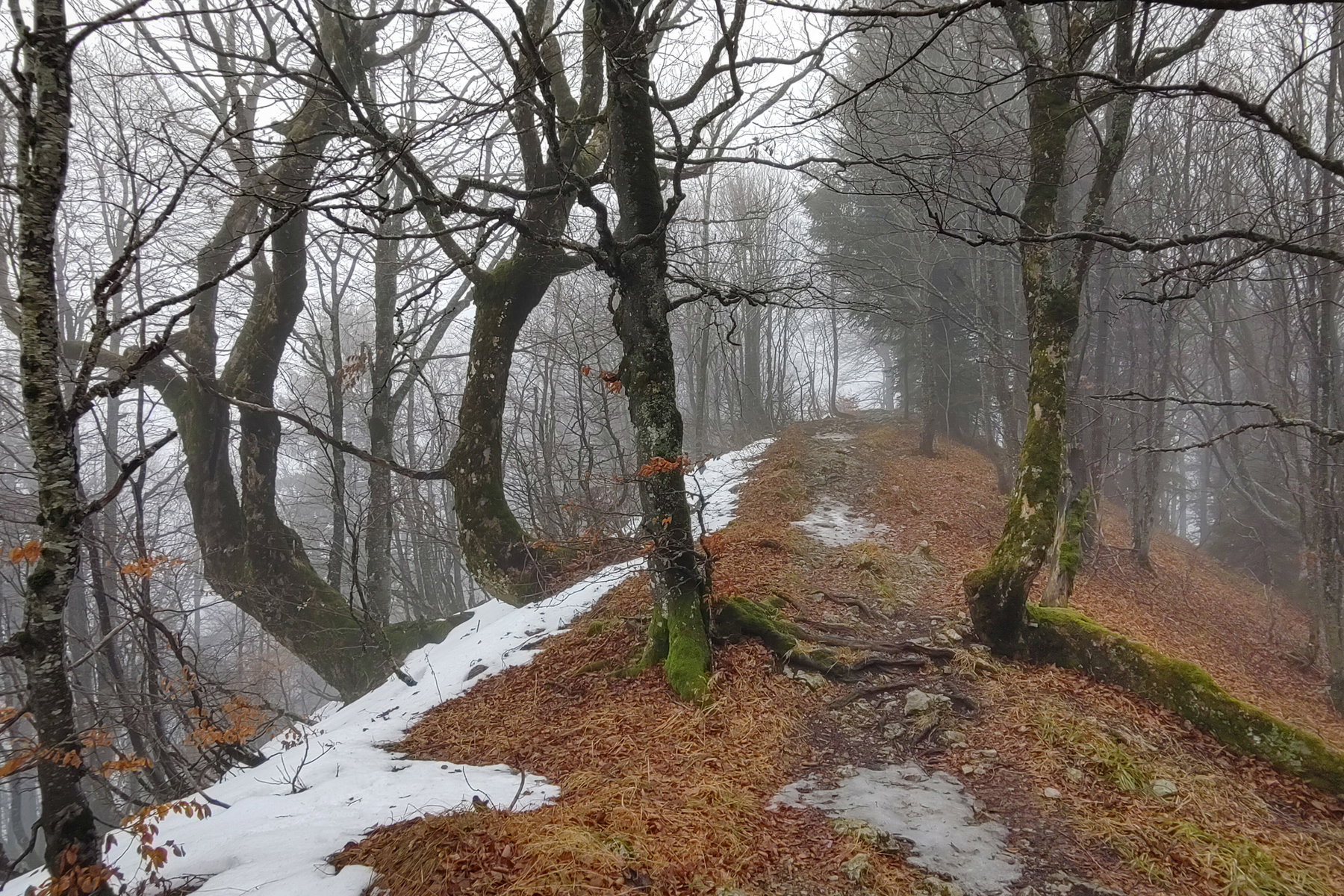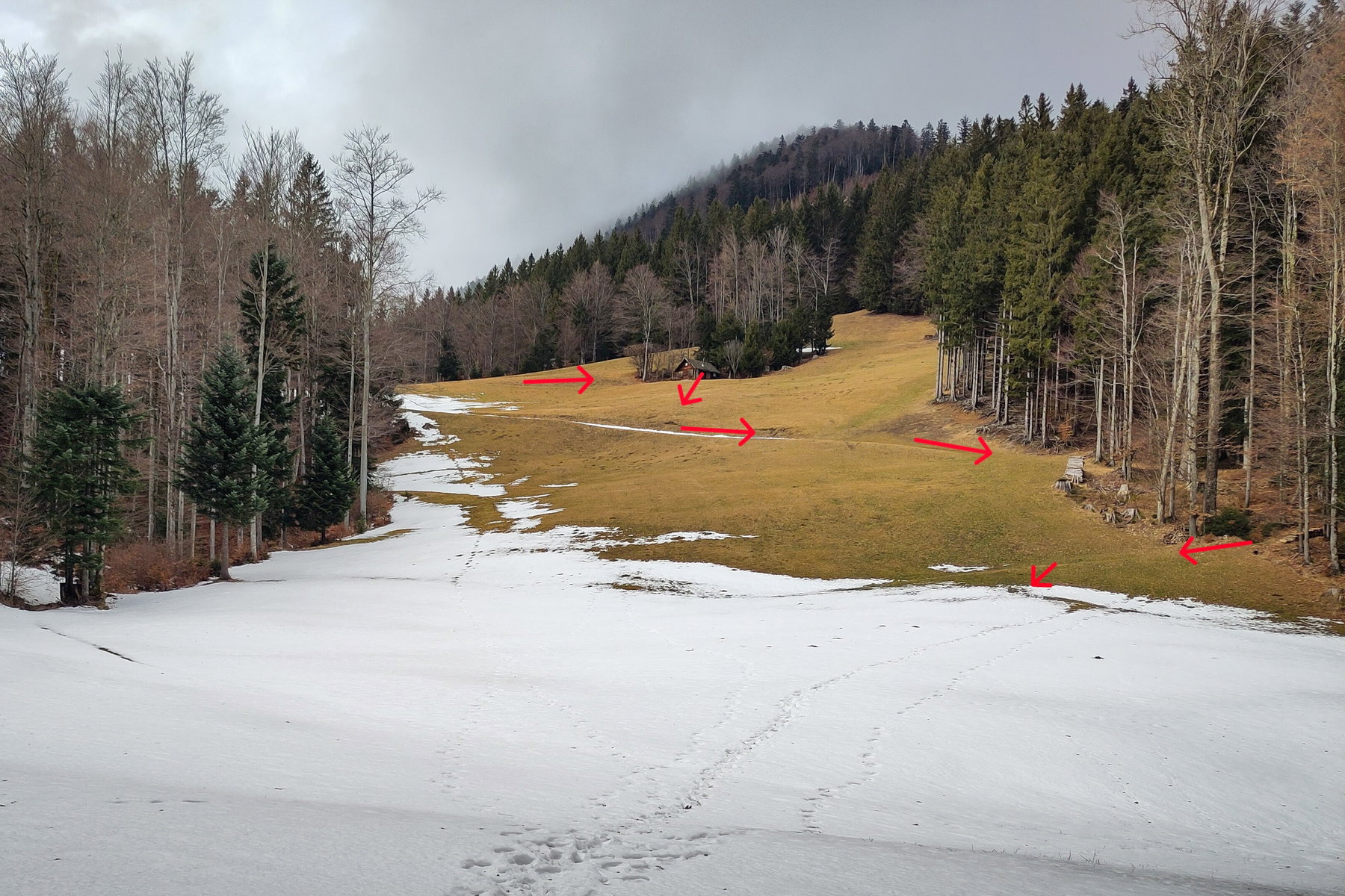 Die steilen, nordseitigen Gipfelwiesen hat noch der Schnee im Griff, am Grat-First haben Fußstapfen den Schnee zu Eis verdichtet.