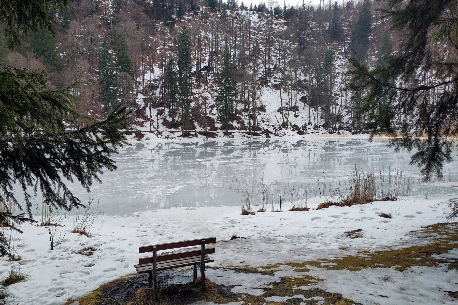 Ohne Pause und, ob des Nebels, ohne Panoramablick geht es nun dem Filblingsee zu; diesen Abstecher (zusätzlich 100 Höhenmeter) lasse ich mir nicht entgehen. Und wie er sich lohnt: mattes Sonnenlicht wärmt mich auf einer Bank mit See-Eisblick! (auch Titelfoto)