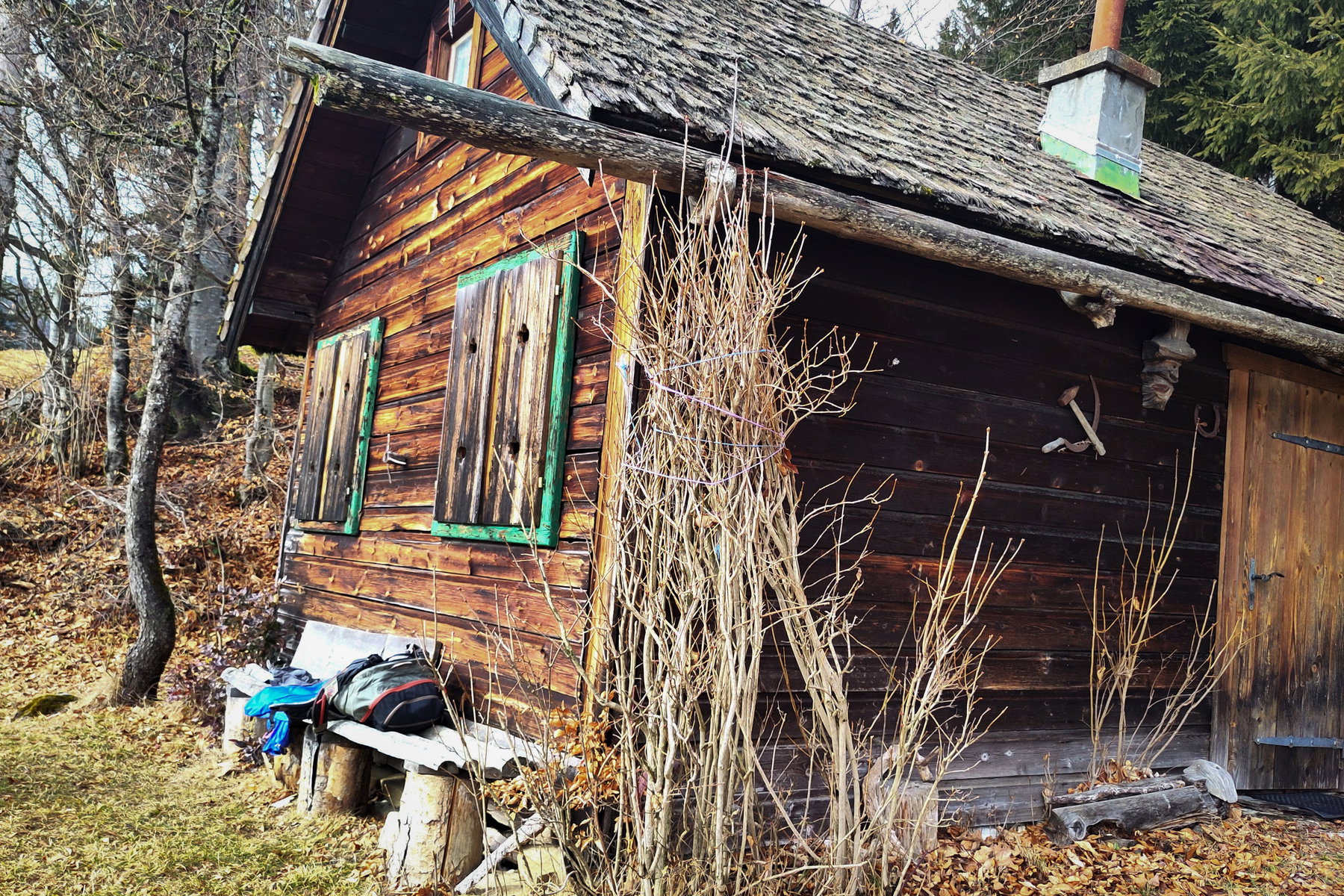 Zunächst erwartet mich dort eine Art Hotel (dieses Haus kann gemietet werden), doch dann, jenseits eines begrenzenden Windschutzstreifens, steht eine Hütte, an der ich nicht vorbei gehen kann, zumal die Sonne herauskommt.