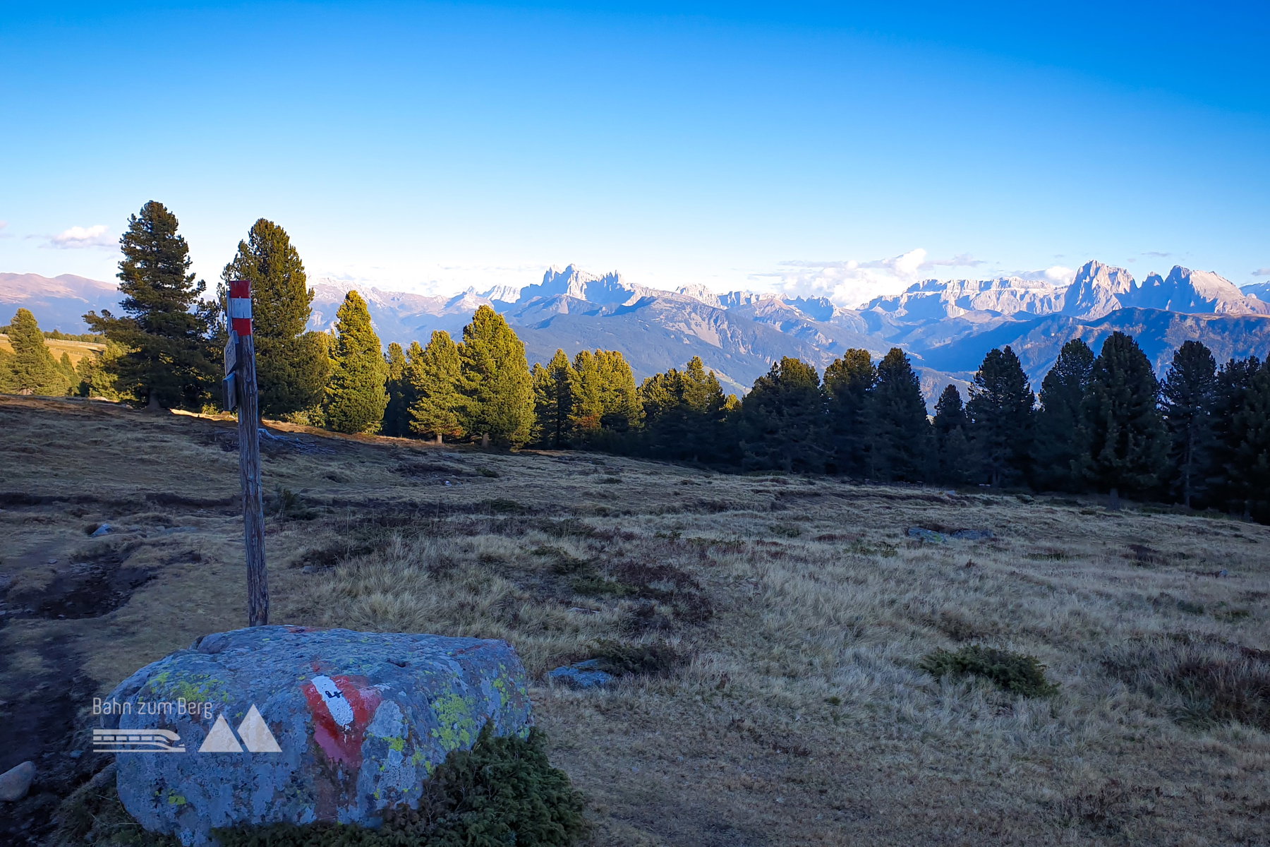 Fast ganz Südtirol von einem Berg aus sehen? Zillertaler-Südseite, Plose, Langkofel, Plattkofel, Marmolata, Rosengarten, Schlern, Latemar, Brenta, Adamello, Presanella, Ortler-Gegend, Texelgruppe – Alles von einem Standort aus. Dazu das rote Alpenglühen am Rosengarten mit der Laurin-Wand. Spektakulär!