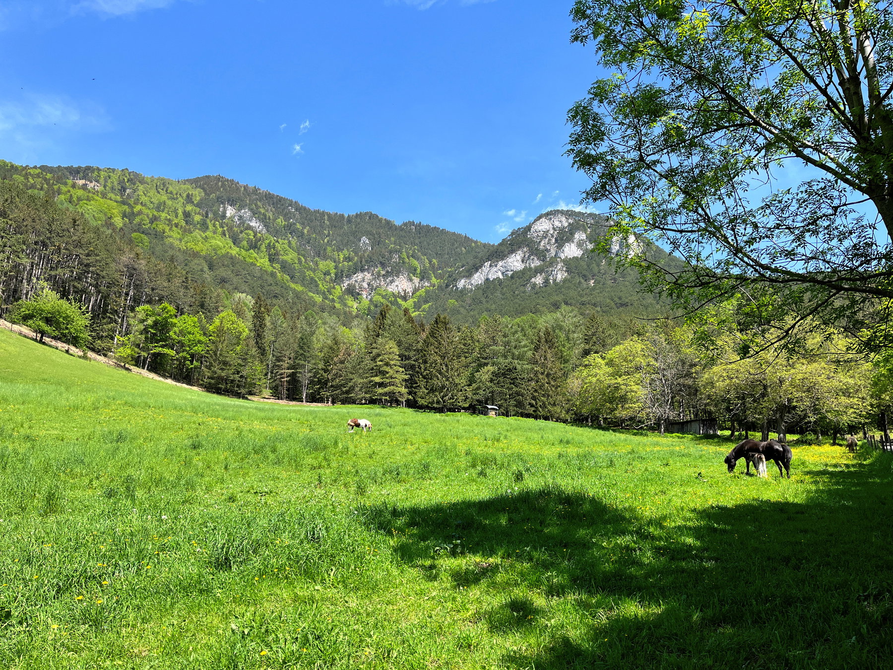 Man kommt dann zu einer kleinen Siedlung (Auf der Wiese) und ab hier muss man leider ein Stück am Asphalt gehen. Da die Umgebung aber wunderschön ist und das Wetter auch, verzeihe ich das der Wanderroute. 🙂 Nach dem Gasthof Seelhofer biegt man links ab und geht die ruhige, in unserem Falle unbefahrene, Straße entlang. Gloggnitz ist schon bald sichtbar und man kommt dann auch wieder auf einen Waldweg. Um kurz nach 5 kommen wir dann beim Bahnhof an und warten auf einer Bank gemütlich auf den Zug. Wir erwischen sogar einen Zug, der mit nur einem Zwischenhalt in Neunkirchen, direkt zum Bahnhof Meidling fährt. Ich wusste gar nicht, dass es diese Verbindung existiert. So komme ich sehr unkompliziert und zufrieden von dieser Wanderung nach Hause.