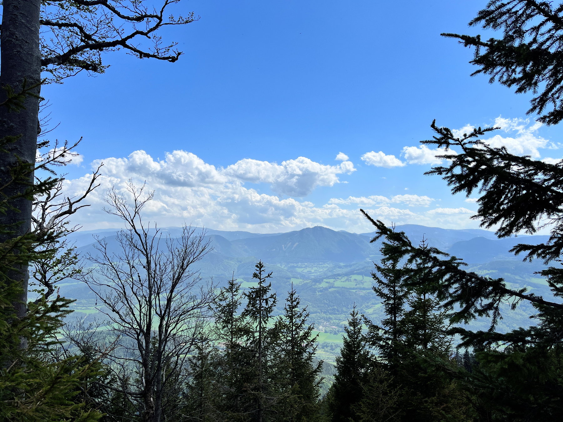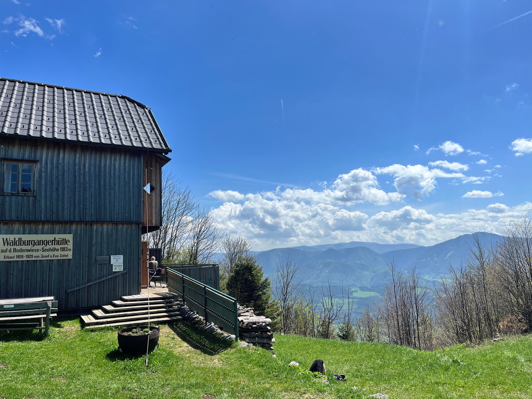 Man folgt dann dem Weg neben der Hütte bergauf und erreicht kurz darauf den höchsten Punkt der Tour. Es kommt dann eine schöne Lichtung mit fabelhaftem Ausblick, wo wir uns zum Jausnen niederließen. Wir trödelten und genossen die Sonne.