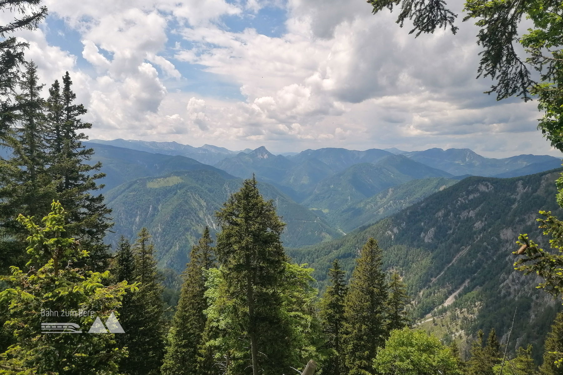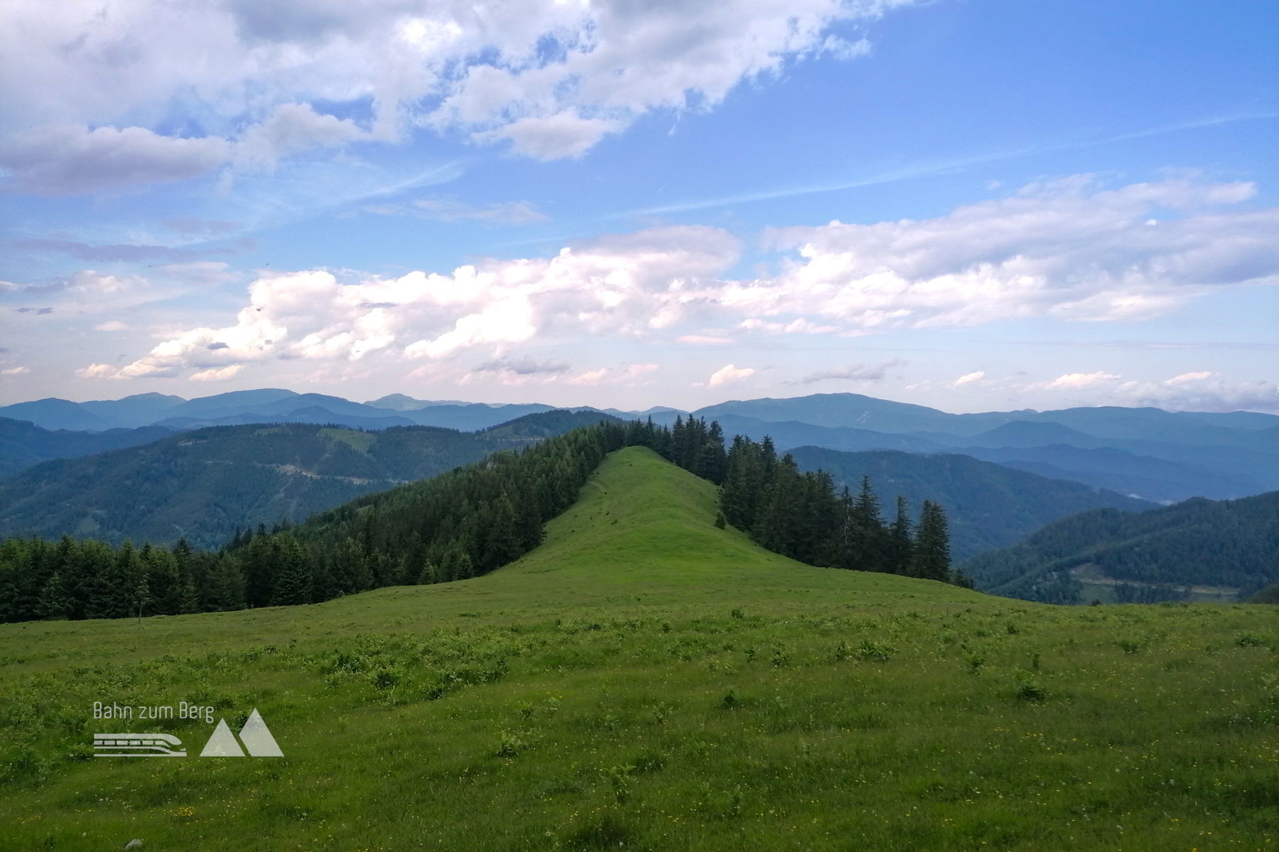 Ab dem Großen Rossgrabensattel ist ein Abschnitt des Weges auf der Forststraße und bergab. Ich mag das ja eigentlich gern, wenn nach mehreren Stunden hoher Konzentration ein Stück Forststraße kommt und mein Geist sich entspannen kann. Die Ausblicke sind immer wieder sehr schön und wir erkennen die Rax, die Schneealpe und noch so manch andere Gipfel.