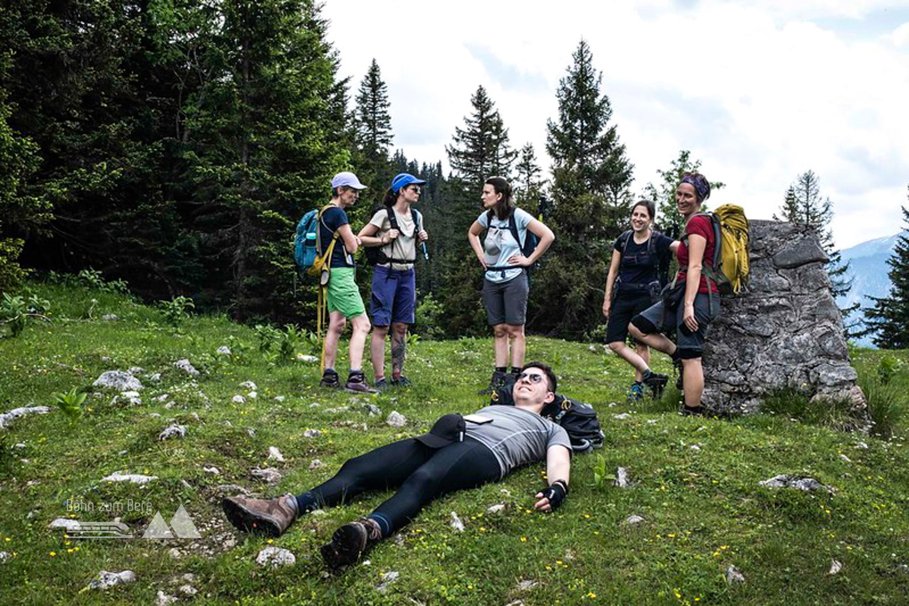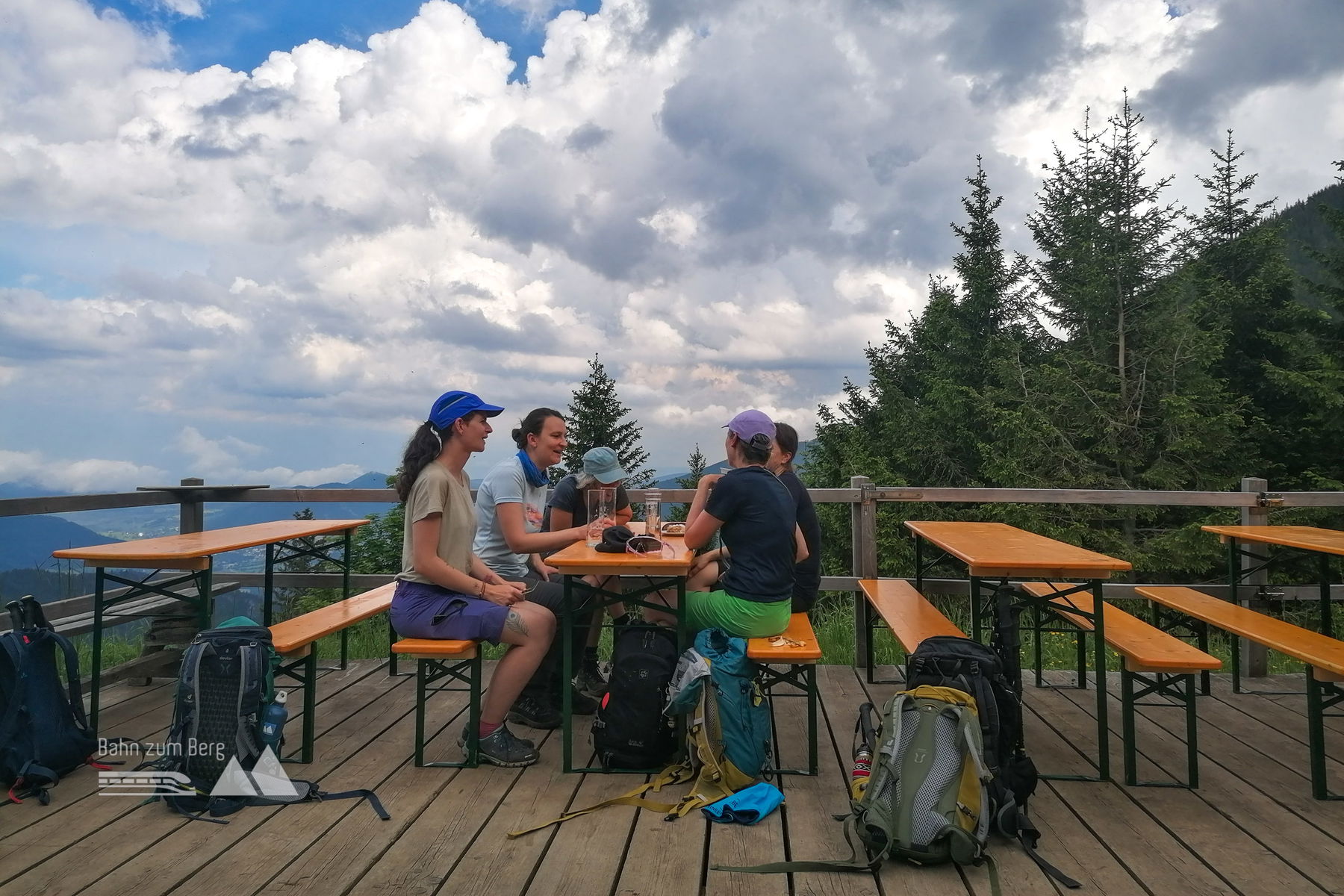 Die Kienthalerhütte ist unsere erste Zwischenstation. Da wir langsam unterwegs sind, uns an das Tempo und die Pausenwünsche von allen anpassen und immer noch viel reden, sind wir dort erst kurz vor Mittag. Wir genießen unsere Getränke, posen für tolle „Bahn zum Berg“-Fotos und blicken etwas ehrfürchtig zum Klettersteig auf den Turmstein, den man von der Kienthalerhütte aus gehen kann. Aber nicht ohne Klettersteigset! Besonders freut uns, dass die Rekonvaleszenzgruppe nur kurze Zeit nach uns auch auf der Hütte ankommt und wir unser Wiedersehen feiern können.