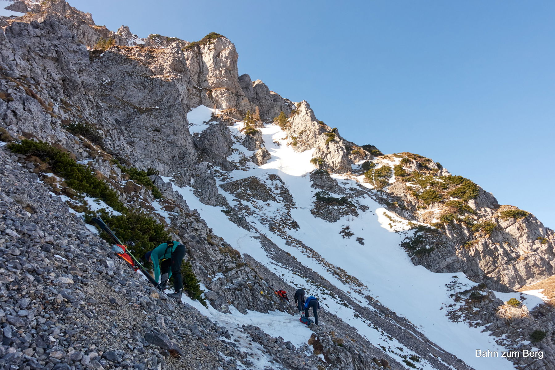 Nach dem Schotterfeld wechselt der Fadensteig nach rechts in den Schatten. Ab hier sieht man dann schon, ob sich Steigeisen auszahlen oder nicht: Am Weg ist der komprimierte Schnee immer wieder getaut und gefroren. Ab hier legen wir Steigeisen an, weil dann nach einem kurzen, steilen Aufstieg die erste Querung kommt.