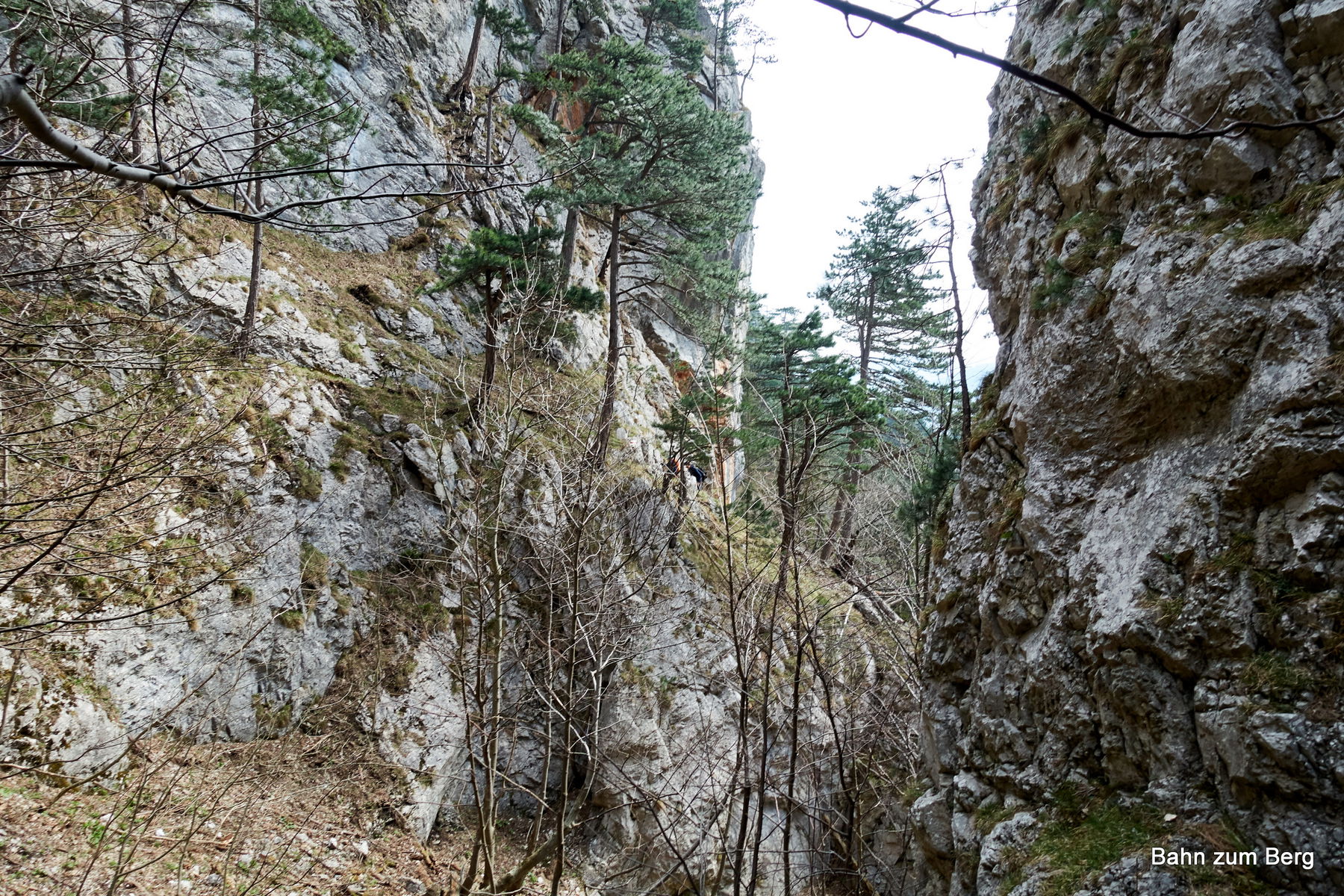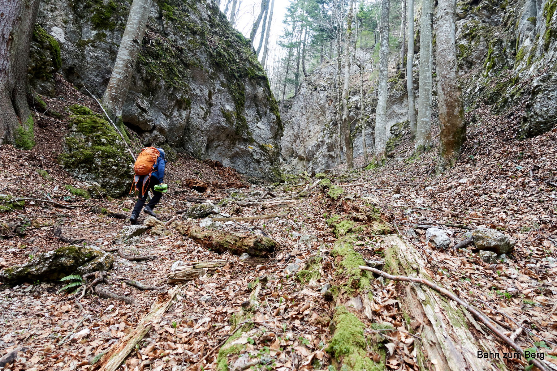 Zum Mariensteig führt der Weg in zwei Serpentinen hinauf. Die Kinder gehen oben am Mariensteig. Die Erwachsenen gehen unten in der Schlucht links vom Steig steil hinauf, weil ich wissen will, ob man dort gehen kann. Ich weiß jetzt: Man kann auch unten in der Schlucht gehen. Ist halt steiler, als oben am Mariensteig.
