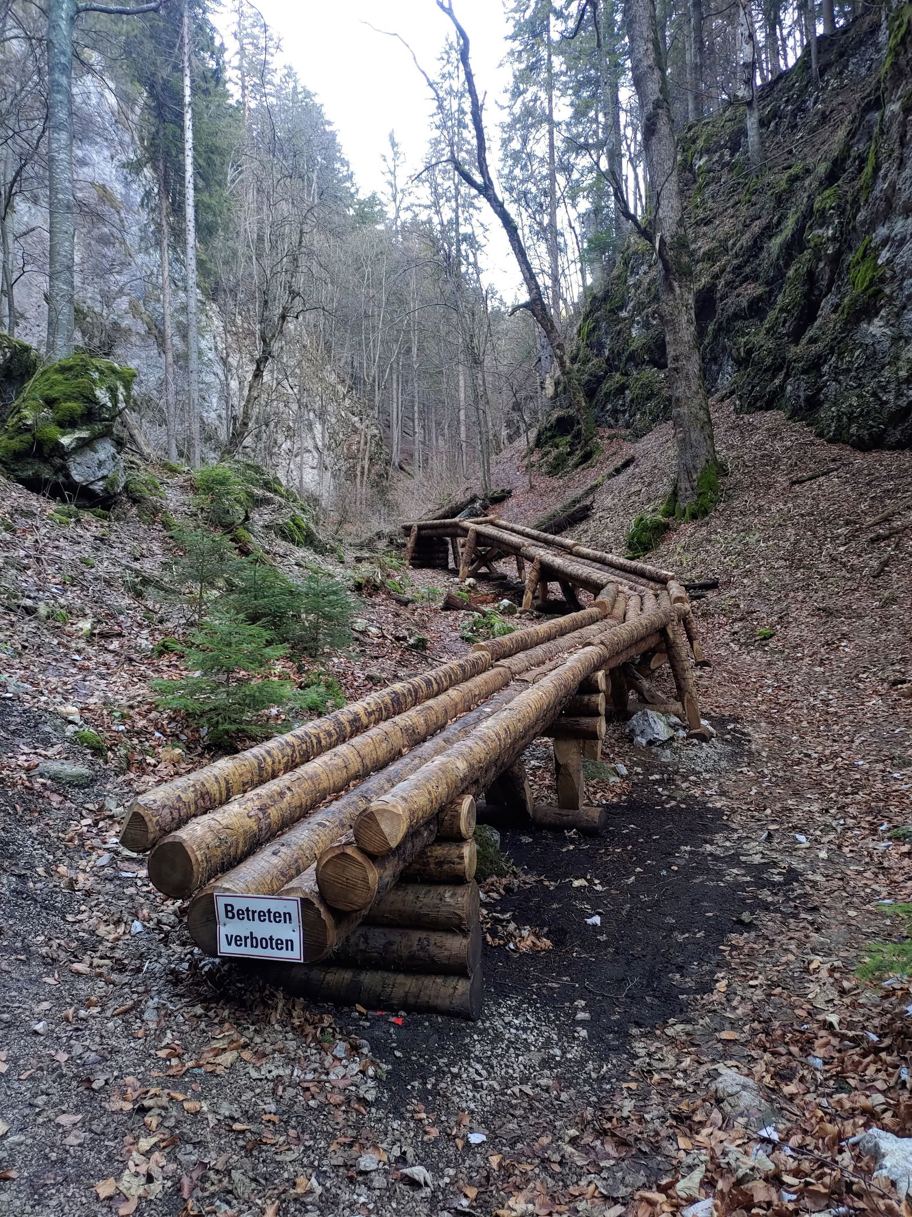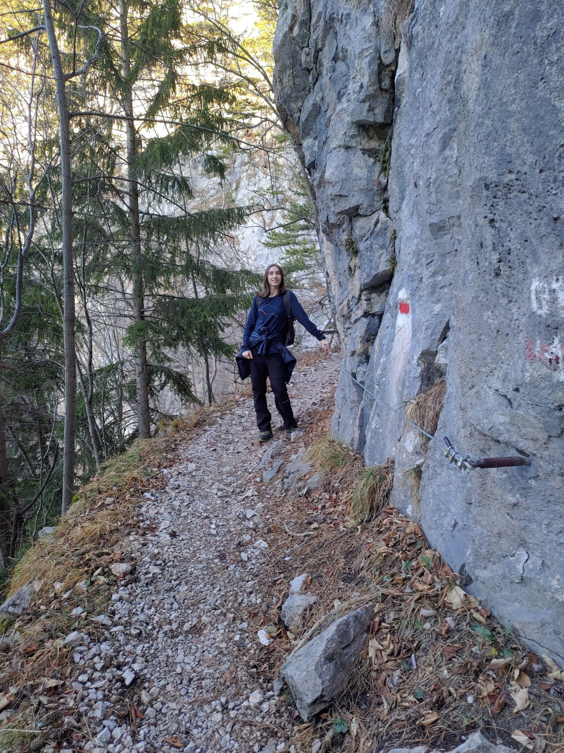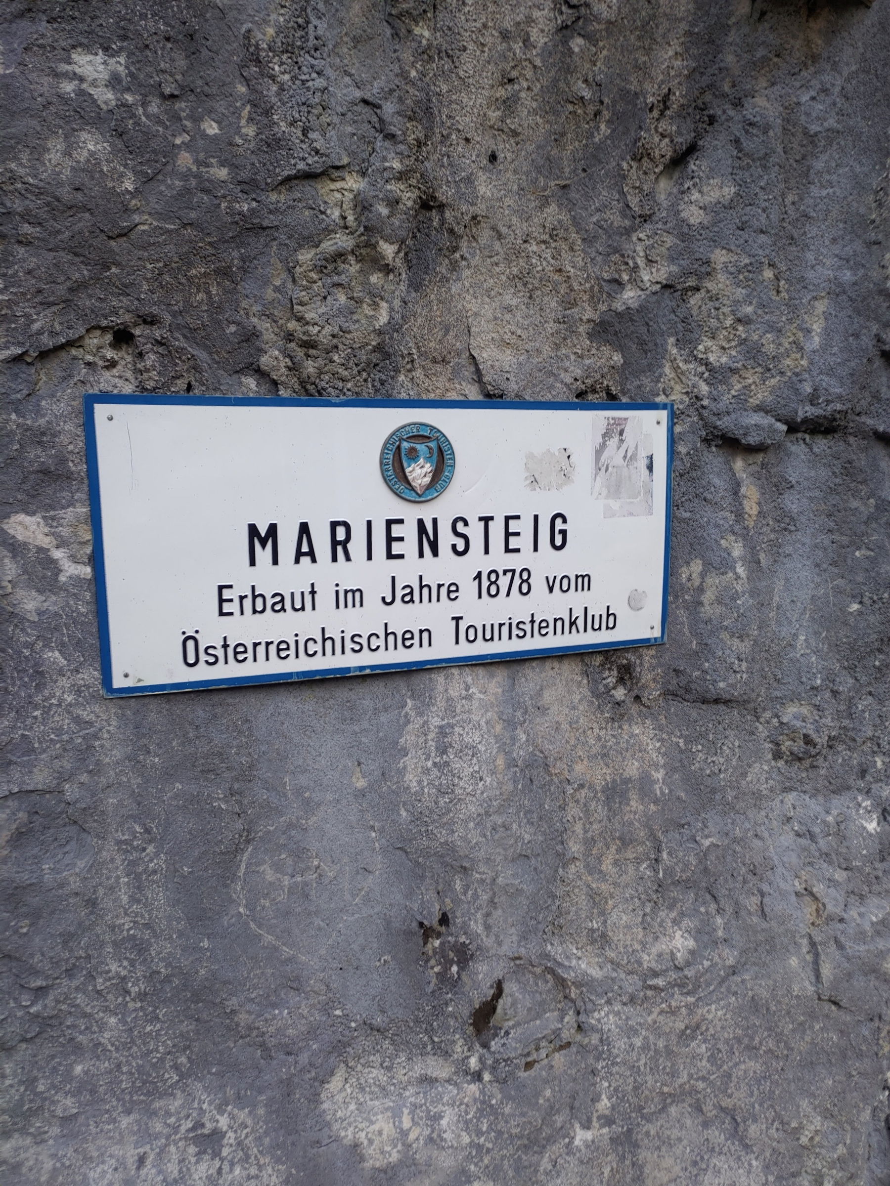 Nach dem Bahnhof gehen wir in Richtung Westen entlang der Schienen bis zu einer Unterführung, vor welcher wir schon den ersten Wegweiser sehen. Wir folgen den Schildern zur Eng/Naturfreundehaus Knofeleben durch die Unterführung. Nach einem kurzen Waldstück geht es anfangs noch auf der Straße an einem Mariendenkmal vorbei, bis der Weg schließlich im Wald zu einer Felswand führt. Dort beginnt der ‘Mariensteig’ durch die Eng. Dieser führt entlang der Felswand, ist gut abgesichert und stellt keine gröberen Schwierigkeiten dar. Nach der Eng, bei einem Holzriesen (eine Rutsche zum Befördern von geschlägertem Holz), zweigen wir links ab zur Knofelebenhütte.