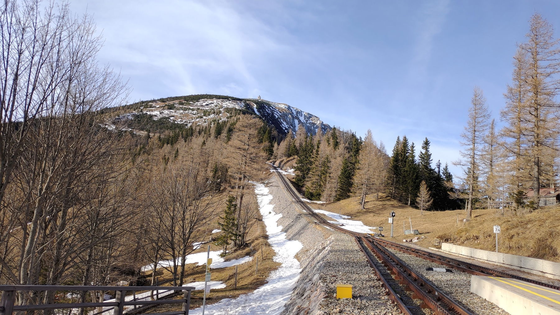 Nach einer ausgiebigen Gipfelrast beginnen wir den Abstieg bis zum Krummbachsattel, dort kommt noch ein kurzer Gegenanstieg bis zur Schneebergbahn-Haltestelle Baumgartner auf uns zu. Ab dieser gehen wir entlang der Schienen die restlichen Kilometer am Zahnradbahnweg hinunter bis nach Puchberg, wo wir in den Zug einsteigen.