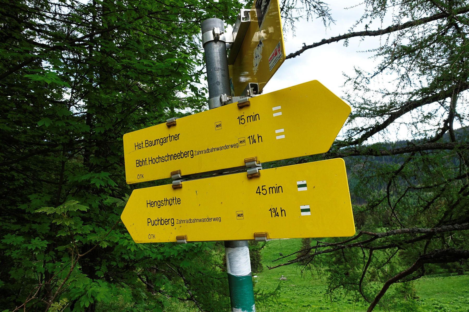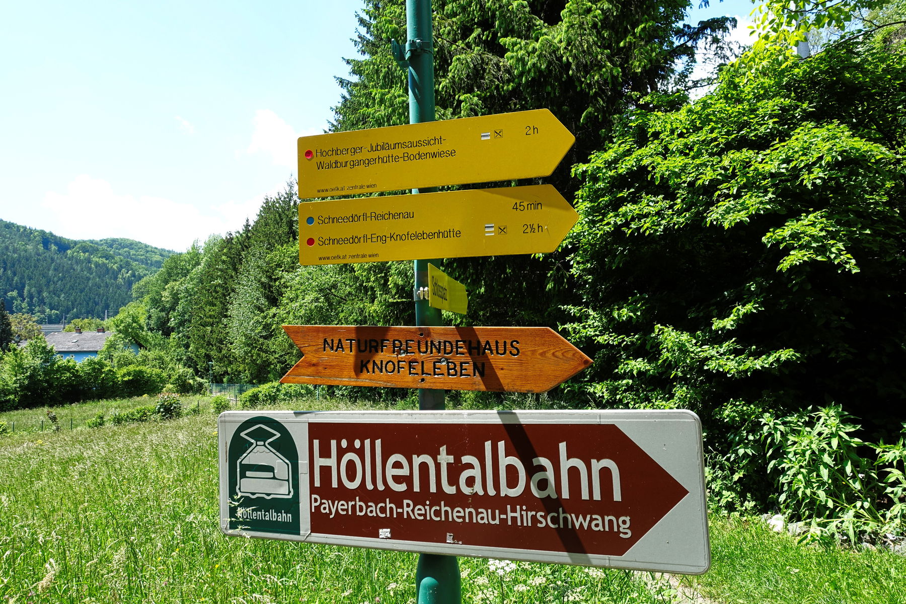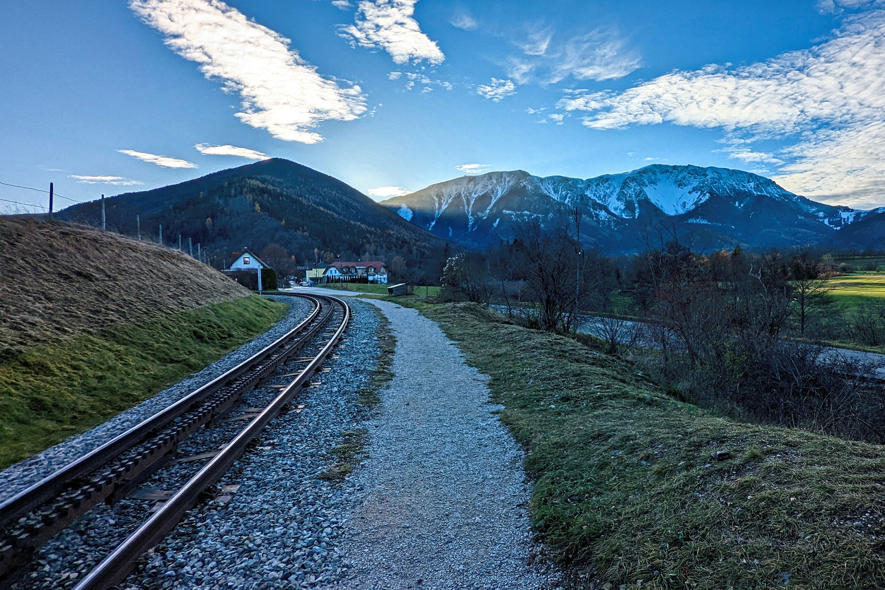 Weiter an der Bahn rechts entlang zum Hauslitzsattel, dann mit roter Markierung durch das Hengsttal hinaus nach Puchberg am Schneeberg und zum Bahnhof.