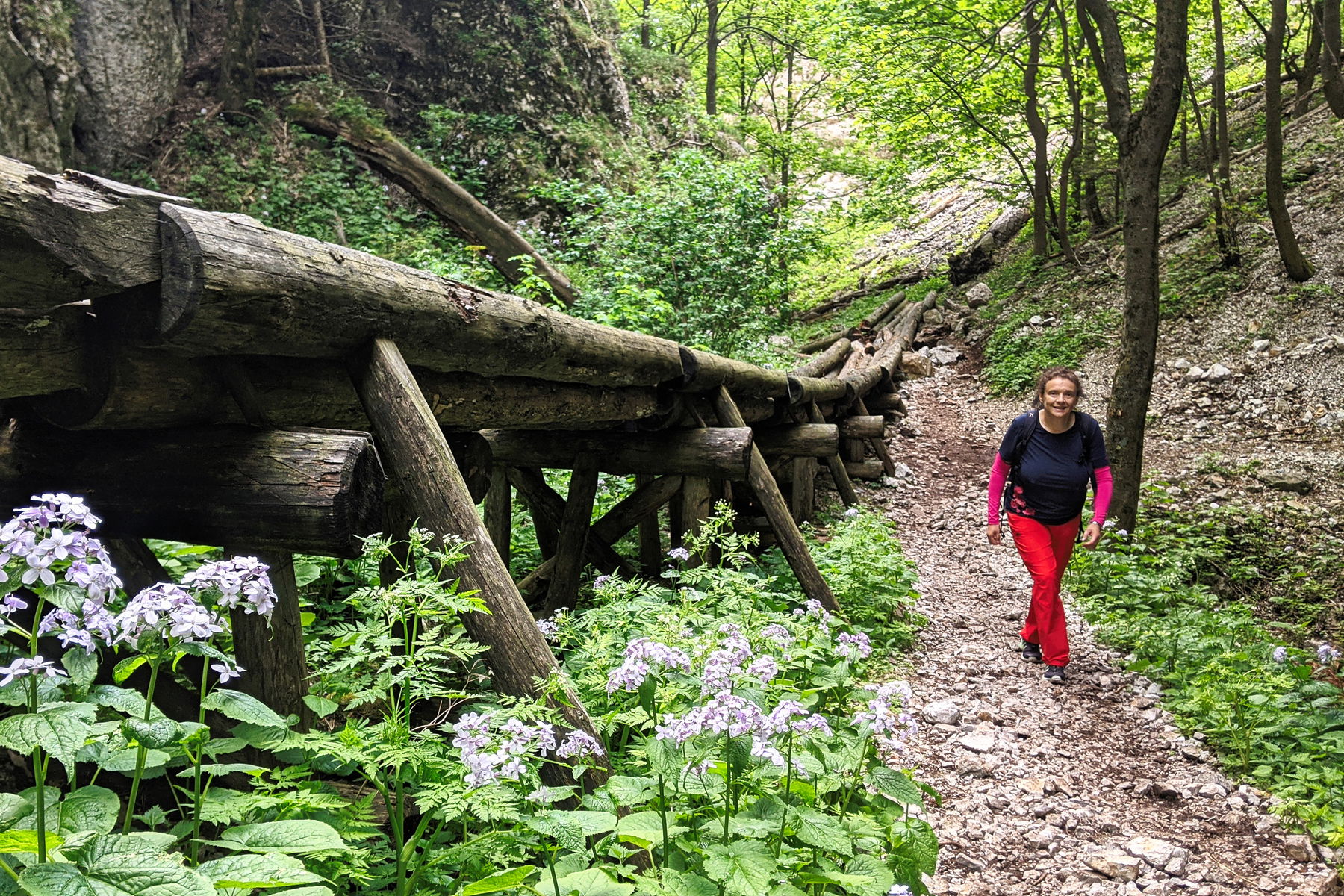 Mit gelber Markierung links in den Mitterberg- (oder Promiska-)graben. Zunächst im Grabengrund dahin, dann auf einem Steig links hinauf zu einer Forststraße schließlich über eine schöne Lichtung zum Naturfreundehaus Knofeleben.