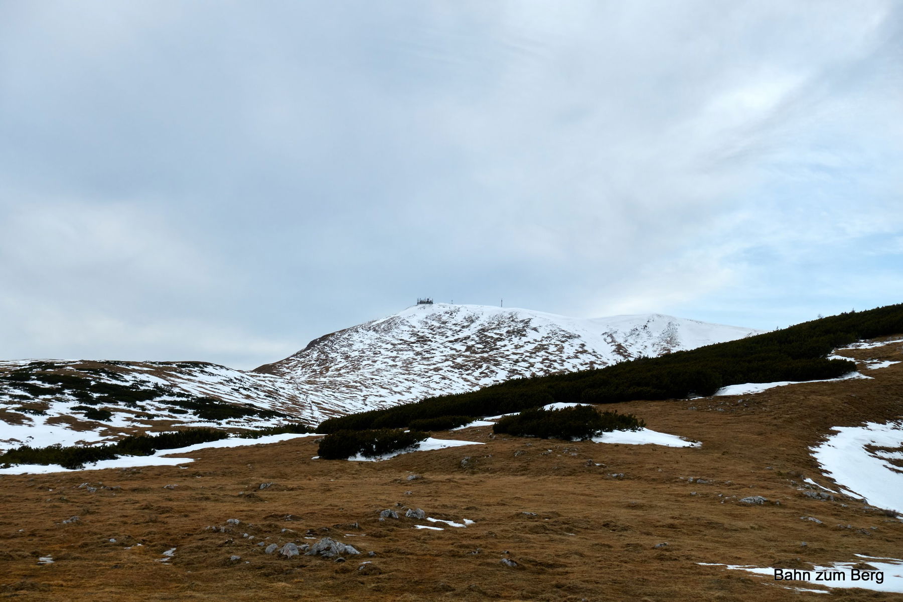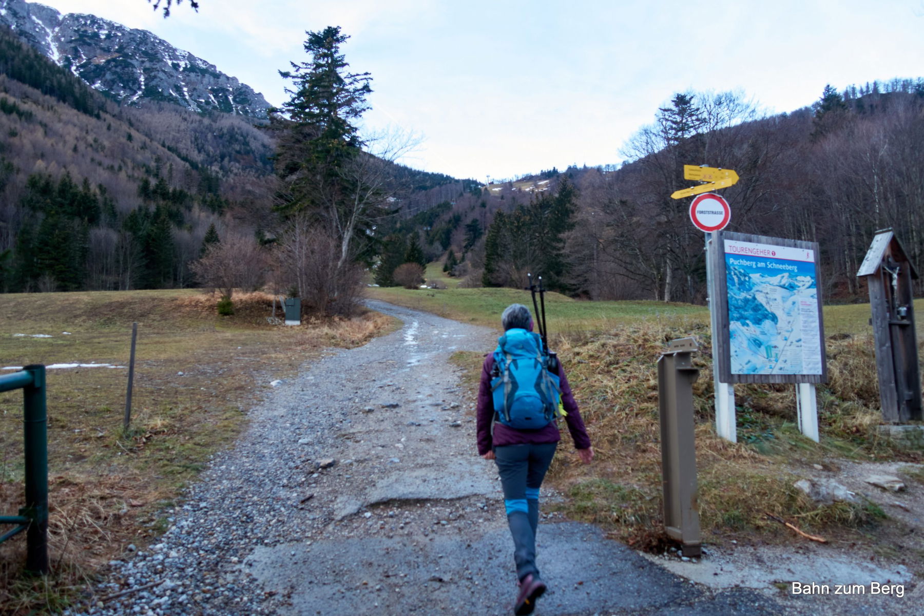 Am Tag vor Weihnachten wollen wir eine Runde auf oder über den Schneeberg gehen – ohne uns aber von Anfang an festzulegen wo wir hinaufgehen wollen. Als wir aus dem Bus aussteigen, legen wir uns einmal fest Richtung Breite Ries zu gehen. Das läßt uns die Optionen Nandlgrat, oder Novembergrat offen.
