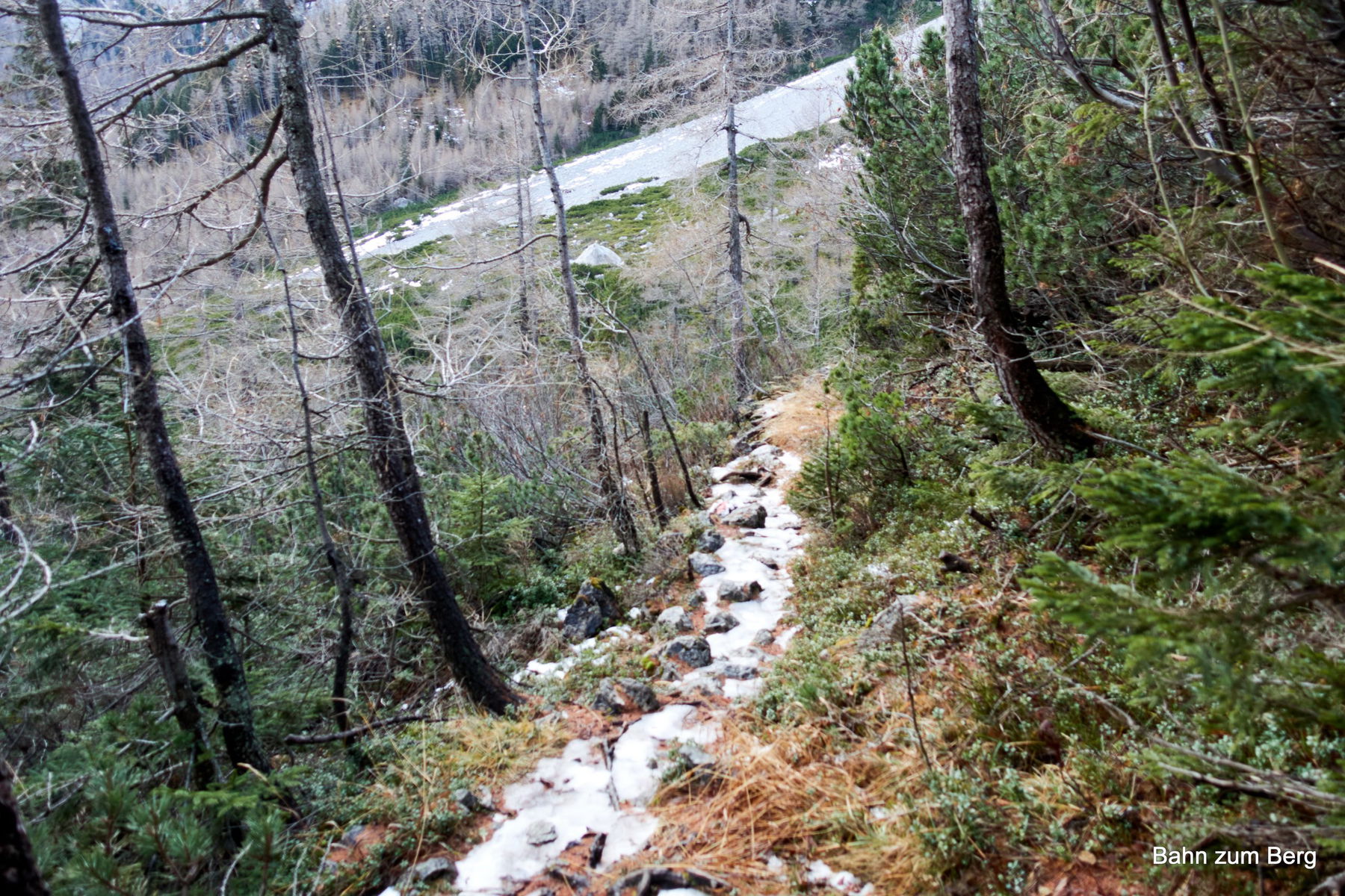Für den Abstieg – inklusive Pausen – brauchen wir vom Damböckhaus bis zum Bahnhof Puchberg am Schneeberg recht genau 3 Stunden. Da jede Stunde ein Zug fährt, ist dieser Bahnhof als Tagesziel ein sehr geeignetes.