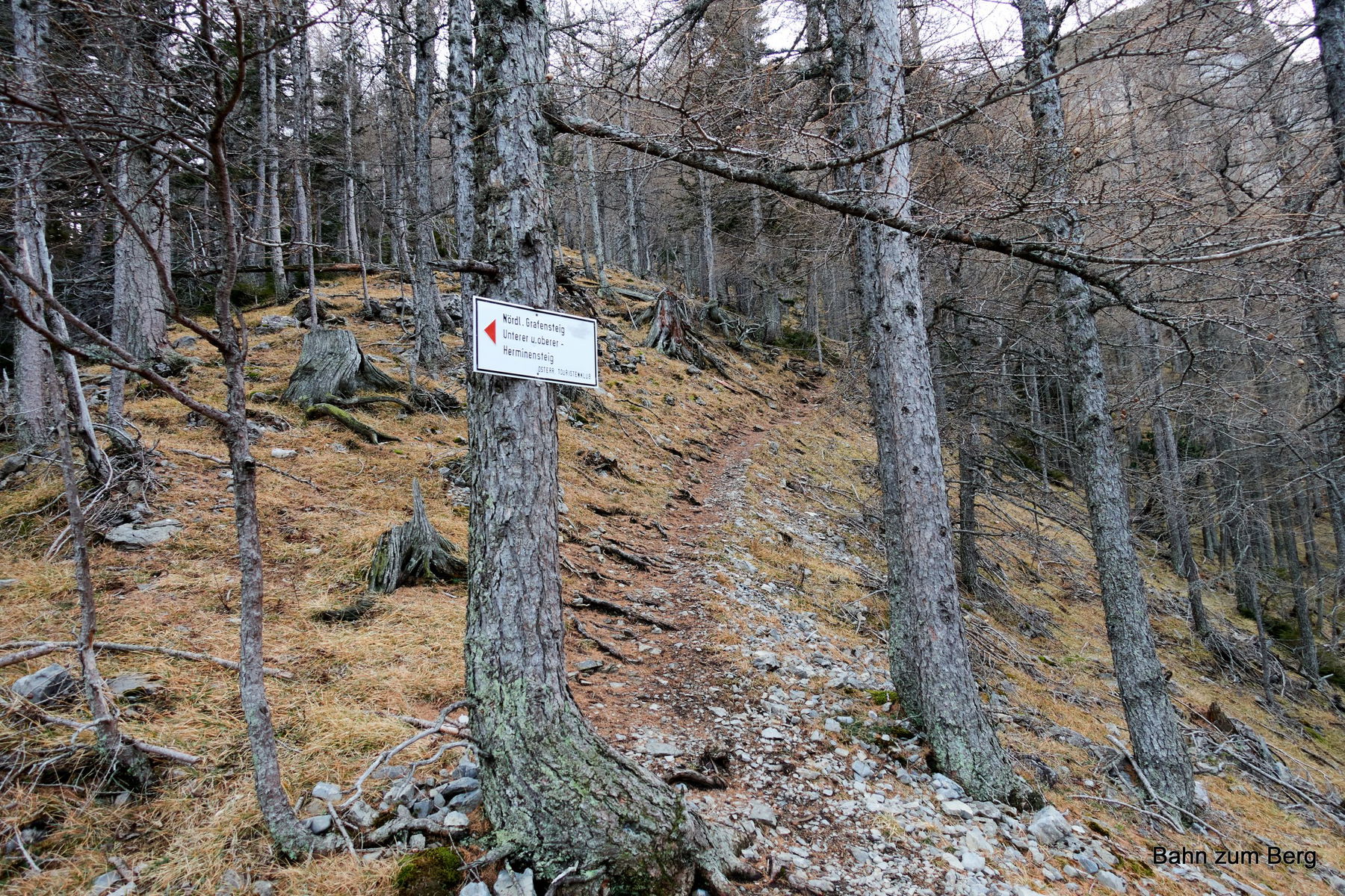 Ich mag den Nördlichen Grafensteig zwischen Edelweisshütte und der Station Baumgartner nicht besonders gerne, weil er schmal und erdig rutschig ist. Das Waldstück nach der Breiten Ries ist ein solches das ich, ob eben dieser Beschaffenheit, nicht mag. Schließlich queren wir aber die Krumme Ries und der nächste Waldabschnitt ist schon der, an dem wir auf den Novembergrat abbiegen.