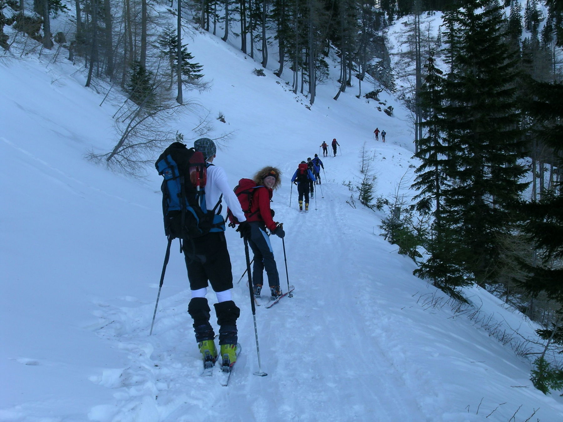 - Über den Schauersteinrücken: Günstiger bei starkem Andrang (entgegenkommende Abfahrer*innen), landschaftlich und aufstiegstechnisch empfehlenswerter und auch lawinensicher. Aus der Mulde links der Heinrich-Krempel-Hütte links aufwärts aus dem Wald bald hinaus und einfach auf den hier nur schwach ausgeprägten Rücken des Schauersteins. Über diesen nach Osten im Bereich der Geländekante zunächst noch in der Latschenzone, dann ab circa 1.820 Meter oberhalb. Rechts vorbei an den beiden eindrucksvollen Dolinen der Schneelöcher (tückisch bei Nebel) und der grünen Stangenmarkierung folgend zur Einmündung in den Fadensteig (gelbe Stangen). Von dort nach rechts ebener Übergang zur nahen Fischerhütte.