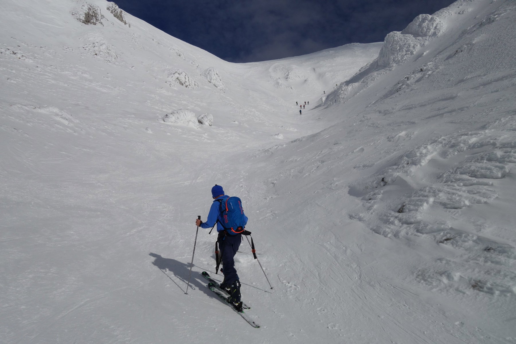 - Durch den Wurzengraben: In der Mulde links der Heinrich-Krempel-Hütte in einen Boden, in dem im Vordergrund Schneegraben und links davon der Wurzengraben Kontur annehmen. Linkshaltend sanft ansteigend zum eigentlichen Beginn des Wurzengrabens, 1.700 Meter. Dieser windet sich nun in Begleitung von Felsabstürzen zur Linken aufwärts. Über das untere und das obere Törl (zwei markante, häufig windverblasene Geländestufen mit schlechterer Schneelage) in offeneres Gelände (ab hier stark dem Wind ausgesetzt, heikel beim Nebel und oft sind Harscheisen erforderlich) und geradewegs nach Osten zur Fischerhütte (zuletzt Markierungsstangen).