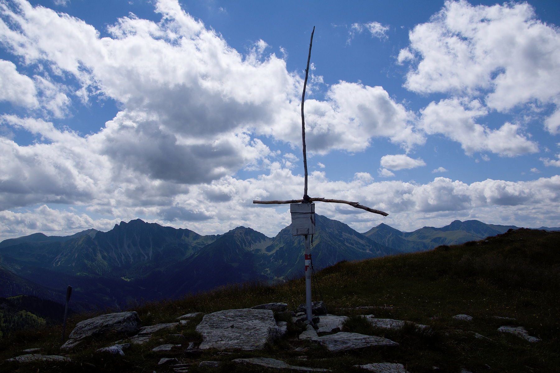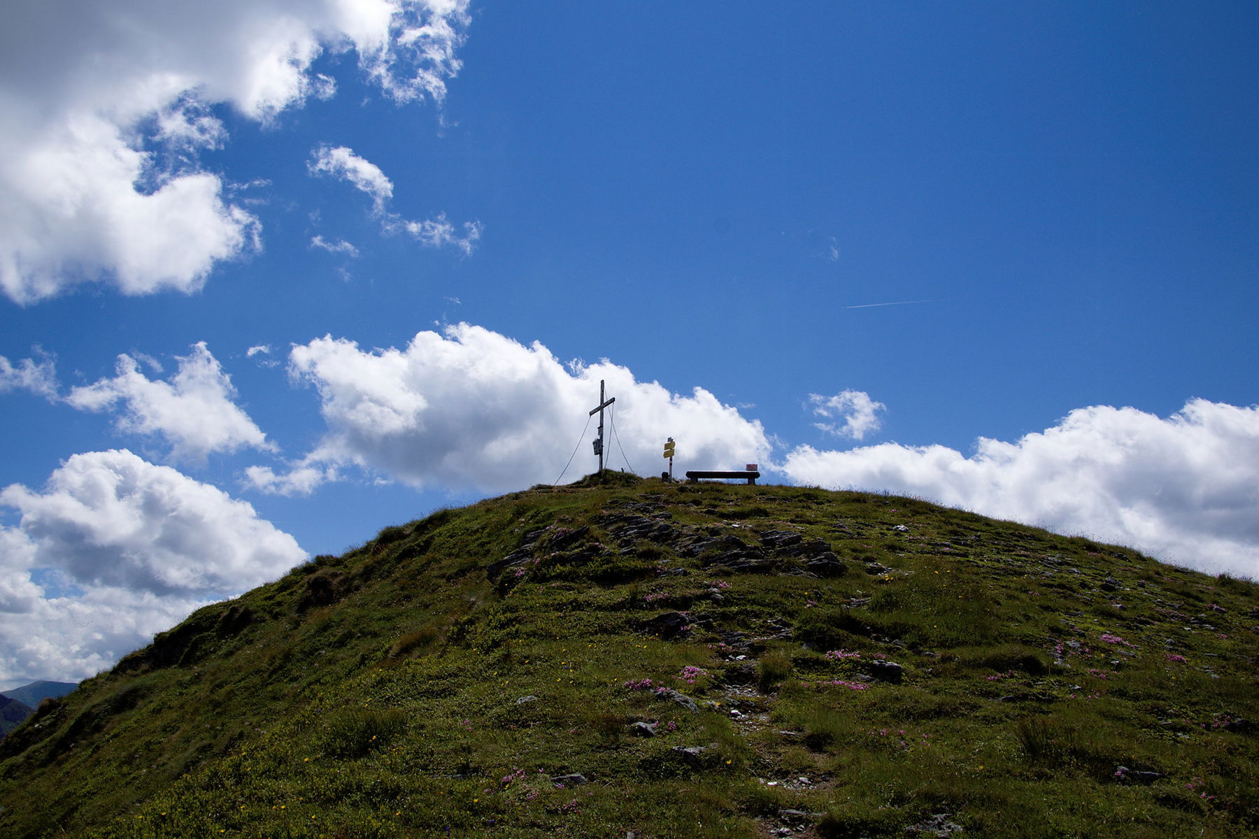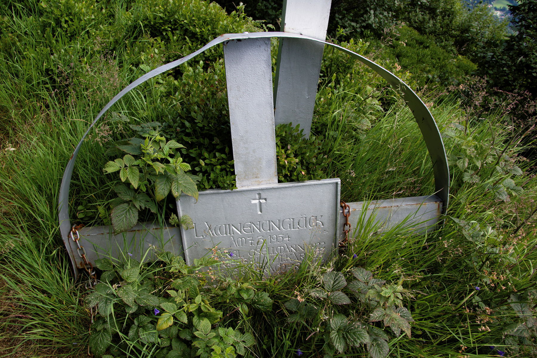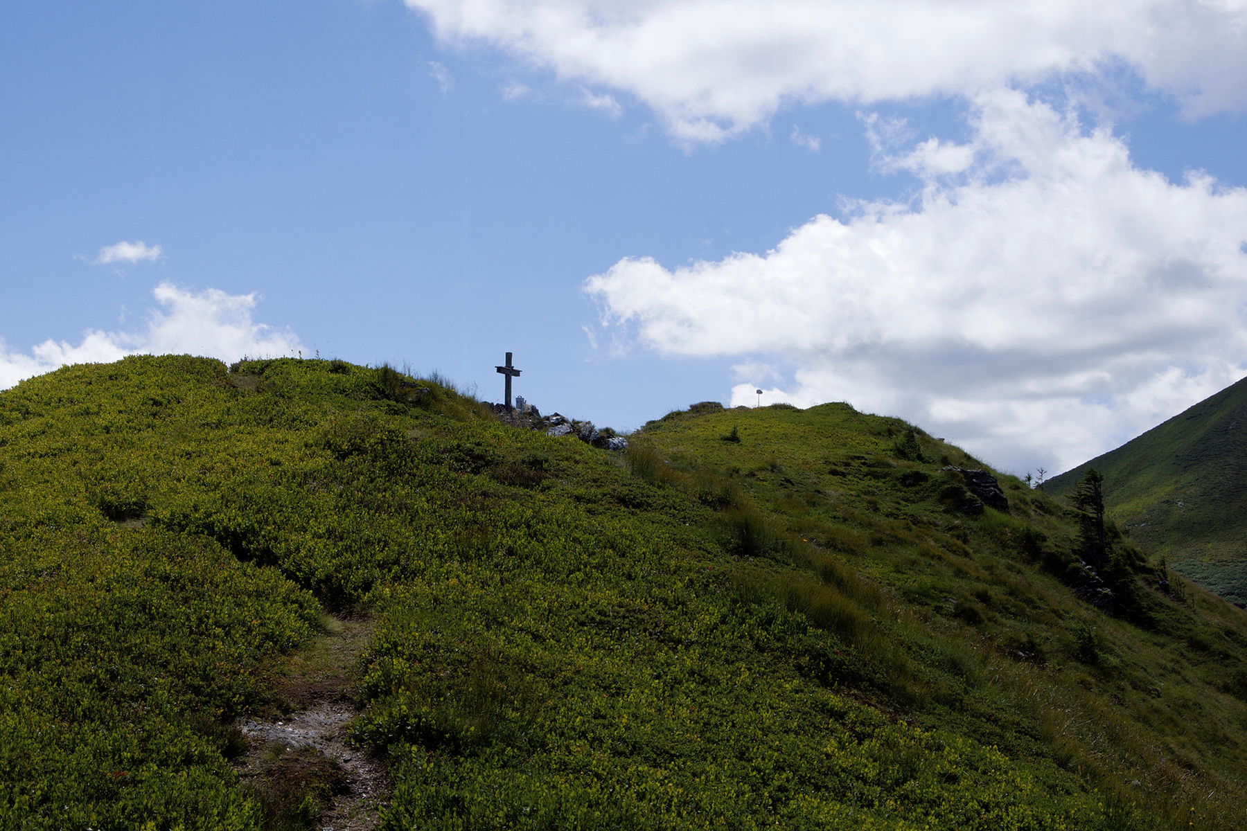 Hier auf diesem Plateau zweigt nach links ein Steig ab. Der ist für die 3G-Läufer. Natürlich kann man ihn auch gehen. Ich bin aber geradeaus und von der rechten Seite auf den Gipfel. Am Lawinen-Gedenkkreuz vorbei überwinde ich die letzten Höhenmeter zum Kreuz.