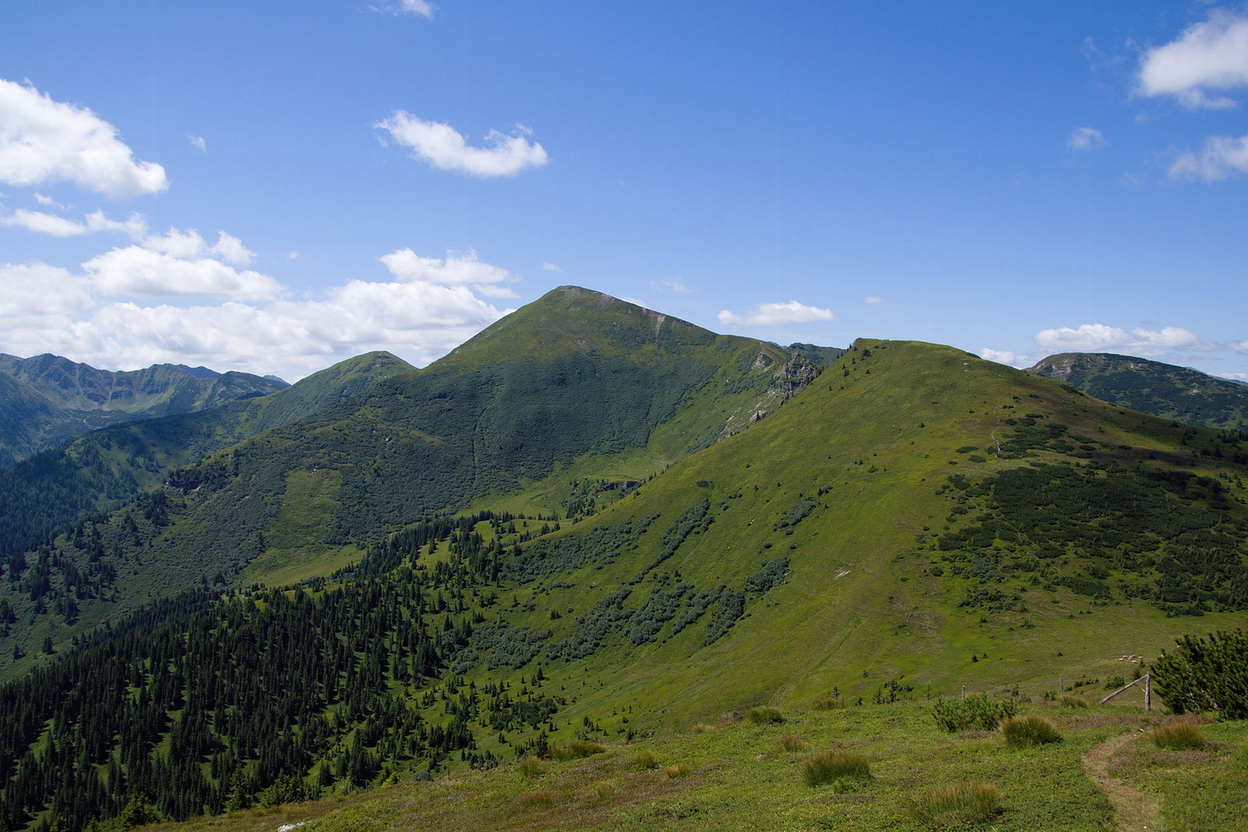 Im Bild ist der weitere Weg schön ersichtlich: Rechts den Kamm entlang und immer rauf und runter. Links vom Kreuz sieht man den Aufstieg zum Himmeleck. Wer nur eine gemütliche Tour machen möchte, kann hier am Großen Schober eine längere Rast machen und wieder über die Schwarzbeeralm absteigen. Vom Bahnhof bis zum Kreuz sind es circa 6 Kilometer.
