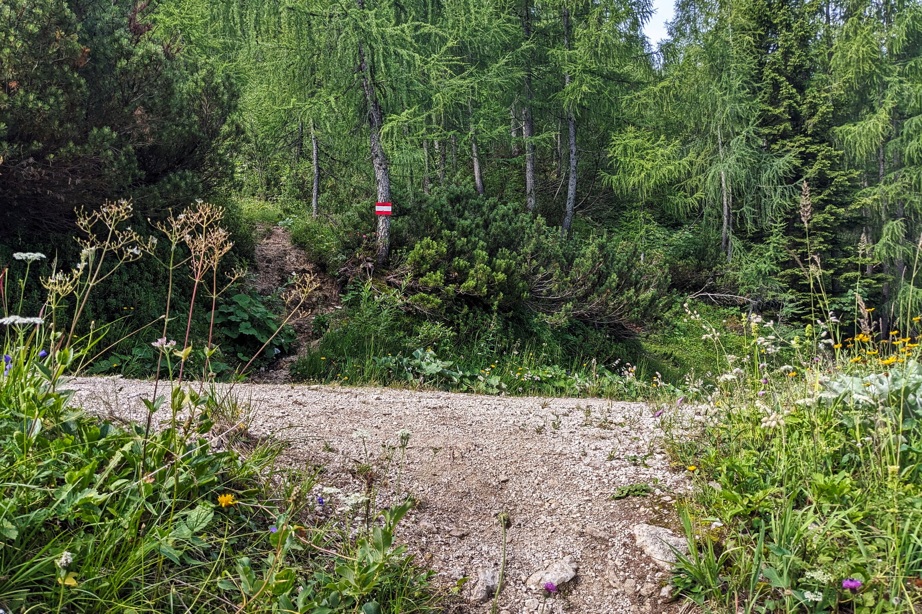 Ein gutes Stück liegt noch vor uns, allerdings so gut markiert, dass wir nie Zeit verschwenden, um den Weg zu finden. Nach einer Rechtskurve leiten uns rot-weiß-rote Markierungen von der Forststraße zurück in den Wald. Die Steigung nimmt leicht zu, zwischendurch ein Schild, das uns noch eine Stunde Zeit gibt, bis zum Gipfel – ab der Kreuzung mit Forststraße zum Sendemasten.