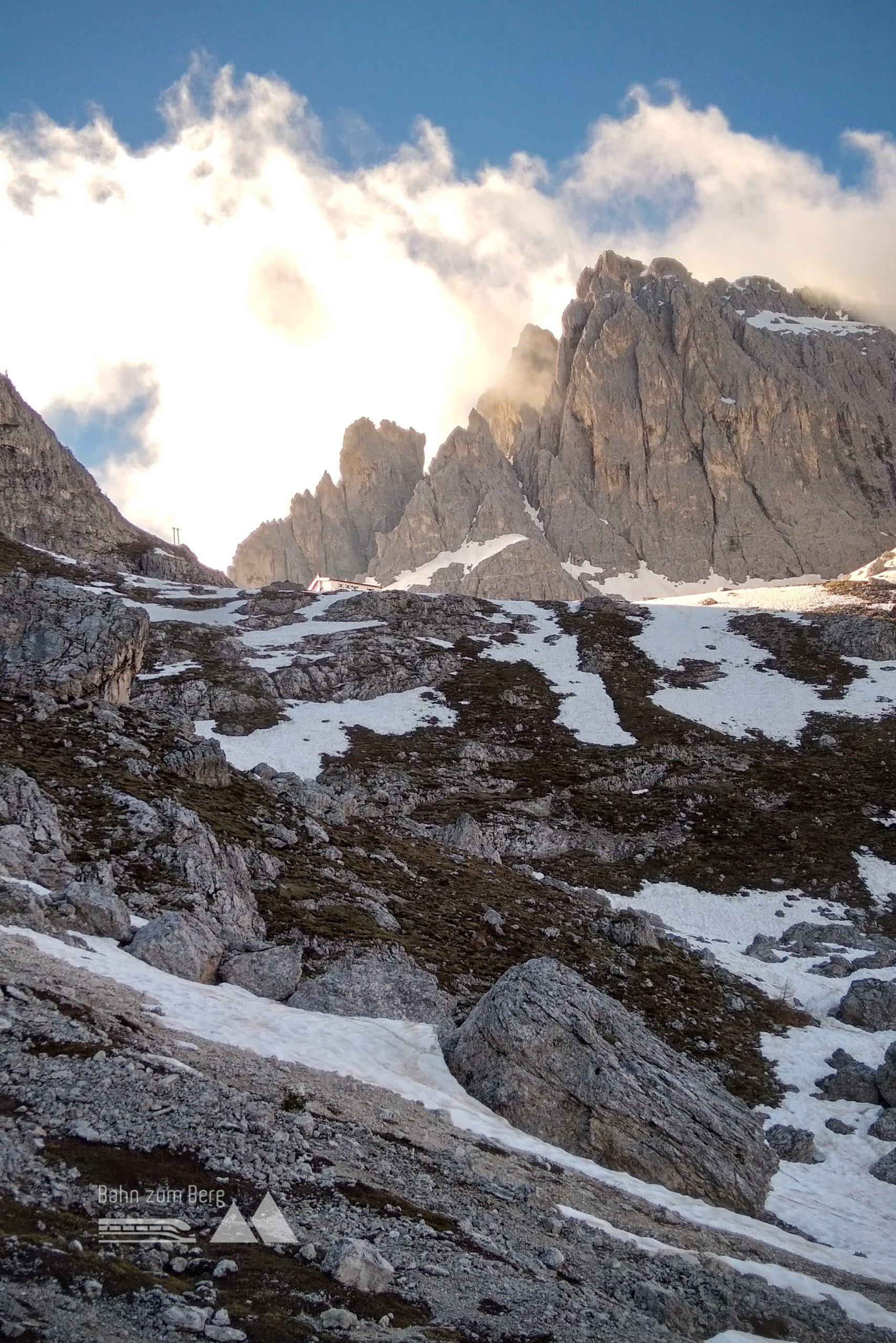 Das Rifugio Flli. Fonda Savio (2.367 Meter), benannt nach den Brüdern Piero, Sergio und Paolo Fonda Savio ist erst seit gestern geöffnet. Am nächsten Morgen wolkenloses Wetter und immer wieder der Ausblick auf die umliegenden Felstürme