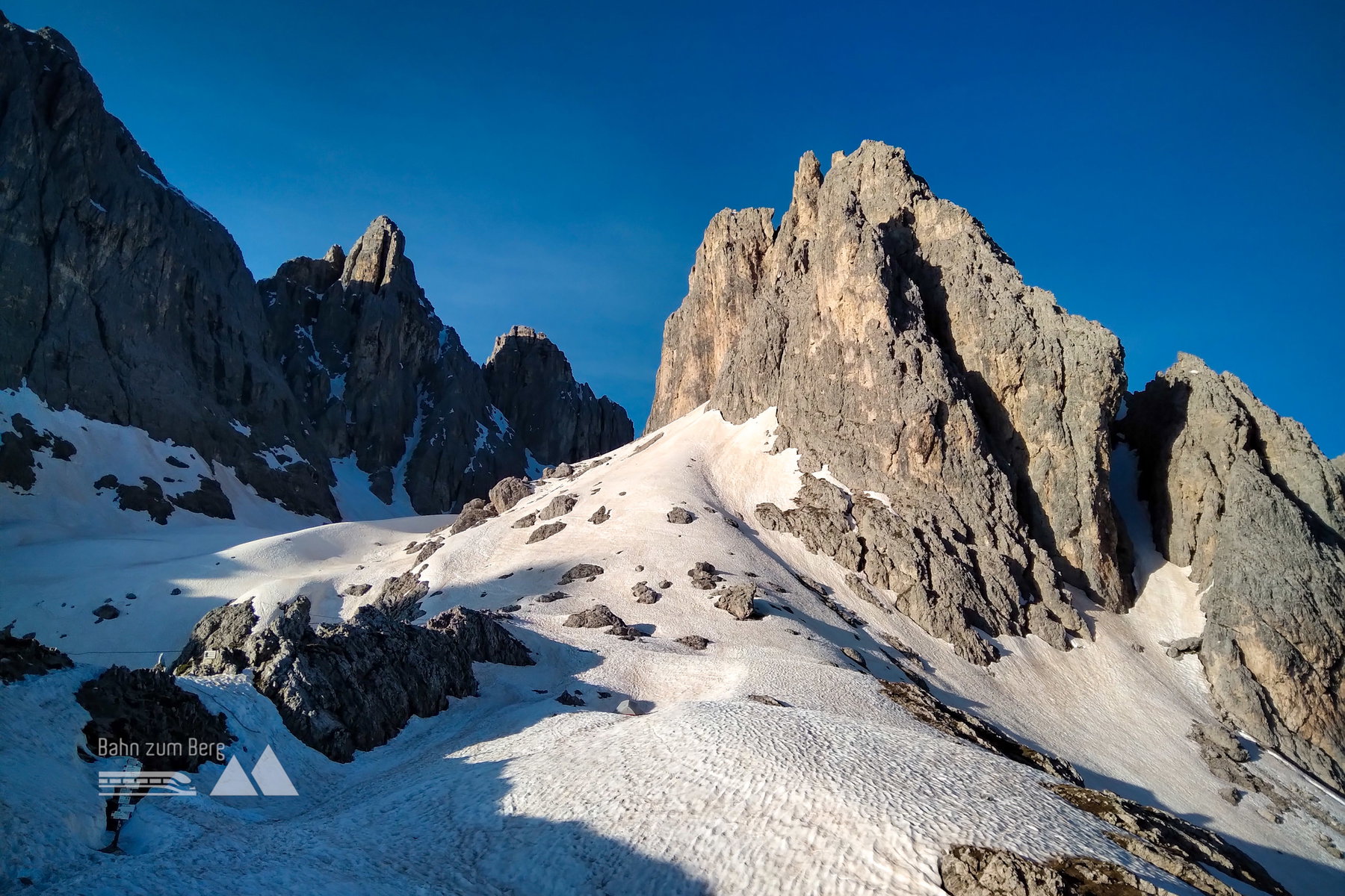 Vom Talschluss geht es steil bergauf. Bald erreichen wir die ersten ausgedehnten Schneefelder unterhalb imposanter Felstürme.