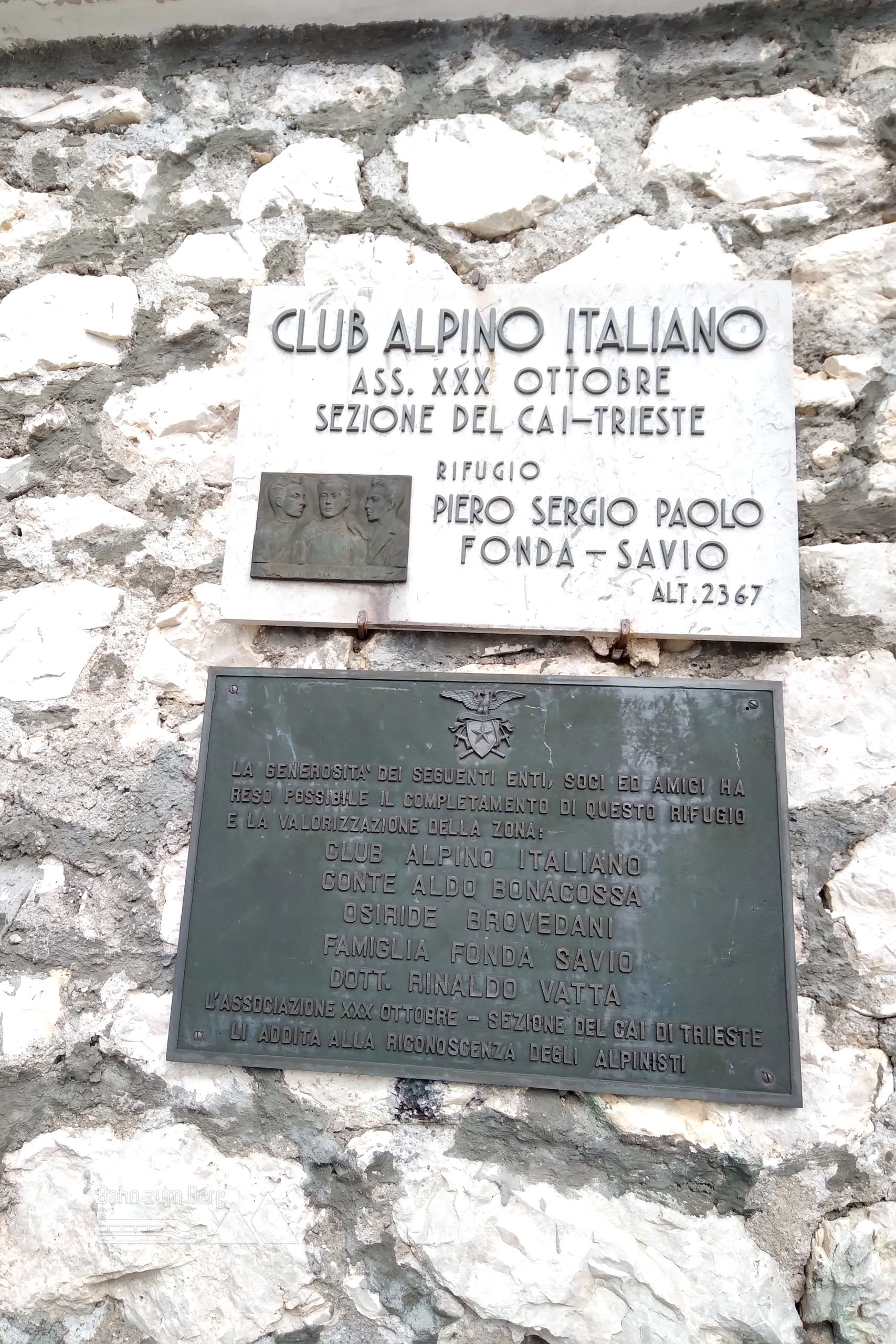 Località Pian dei Spiriti; Rifugio Flli. Fonda Savio; Tafel mit den Gönnern des Rifugio Flli. Fonda Savio. Fotos: Herbert Fuchs