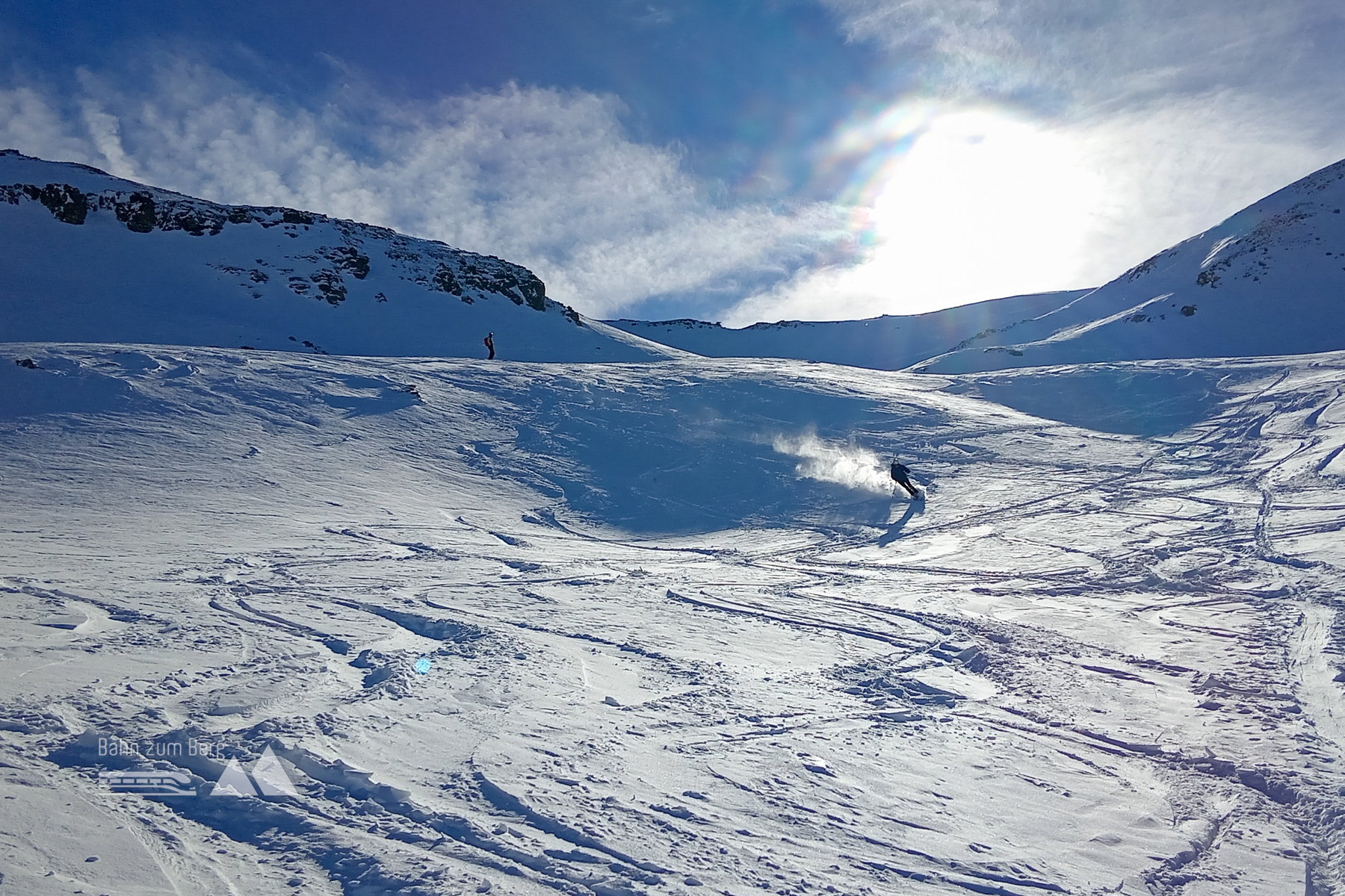 Wir fellen ab und geniessen die schönen Pulverhänge bis zur verfallenen Rotbüelhütte, wo wir dann noch eine gemütliche Rast einlegen. Nun fahren wir das Vergaldatal hinaus, wobei an ein paar Stellen mit den Stöcken nachgeholfen werden muss. Eine Wartezeit auf den Bus kann mit einer Einkehr in der Pizzeria am Schlepplift verkürzt werden.