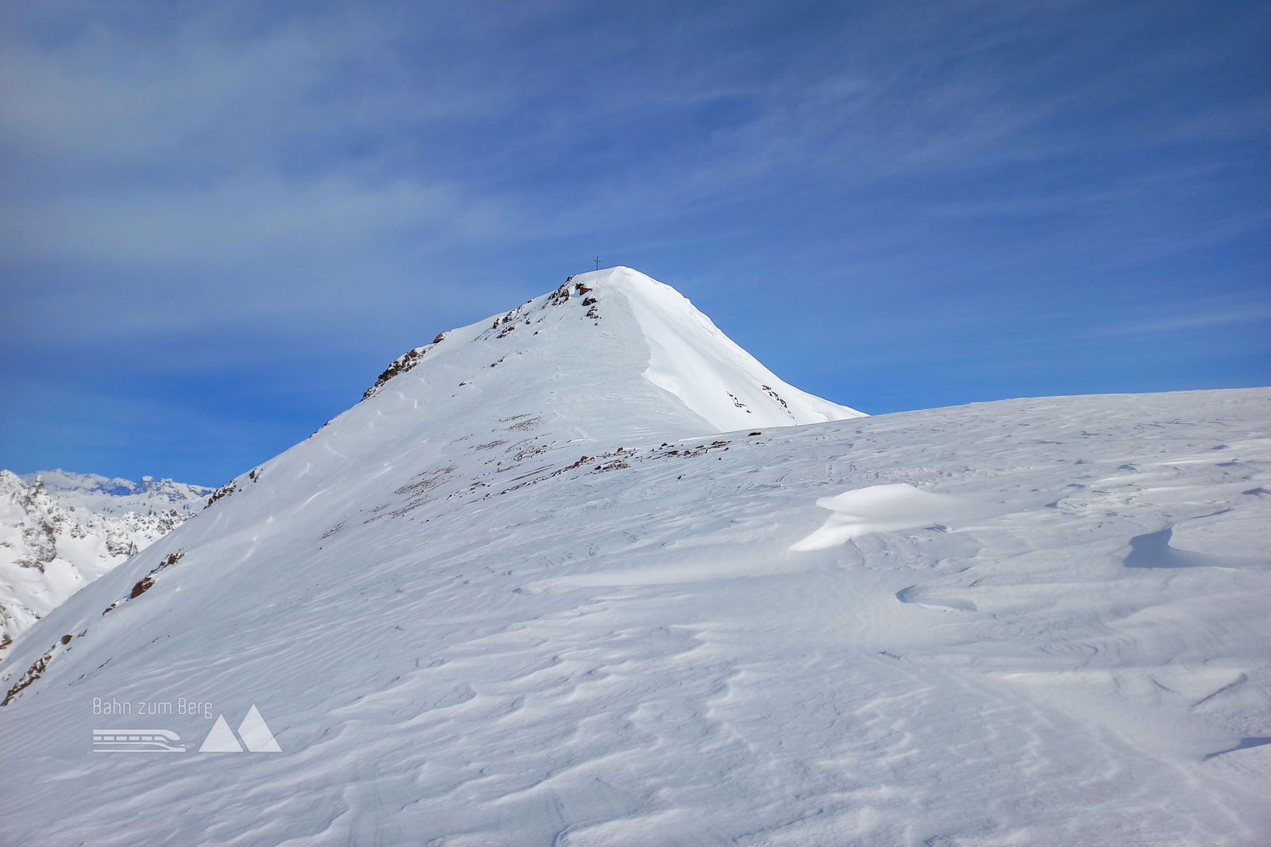 Für den Aufstieg wählen wir den steileren, direkteren nördlichen Teil des Klostertaler Gletschers, auf rund 2.950 Meter wird dann auf den südlichen Teil gequert. Wohl nicht zuletzt durch den gestrigen Schneefall und unseren frühen Aufbruch sind wir die ersten, die hier eine Spur setzen. Dann folgen wir in etwa dem in den Karten eingezeichneten Sommerweg, es geht nicht Richtung Rotfluhlucke weiter, sondern davor links den Aufschwung hinauf. Schließlich wird es gehörig anspruchsvoll und wir müssen Richtung Norden den steilen Hang queren, der uns zwischen Schneeglocke und dem namenlosen Gipfel (3.190 Meter) zum Südgrat/-rücken der Schneeglocke bringt. Das ist eindeutig die Schlüsselstelle der Tour. Das letzte Stück zum Gipfel geht es dann wieder gemächlich, für die letzten ca. 10 Höhenmeter schnallen wir die Ski ab.