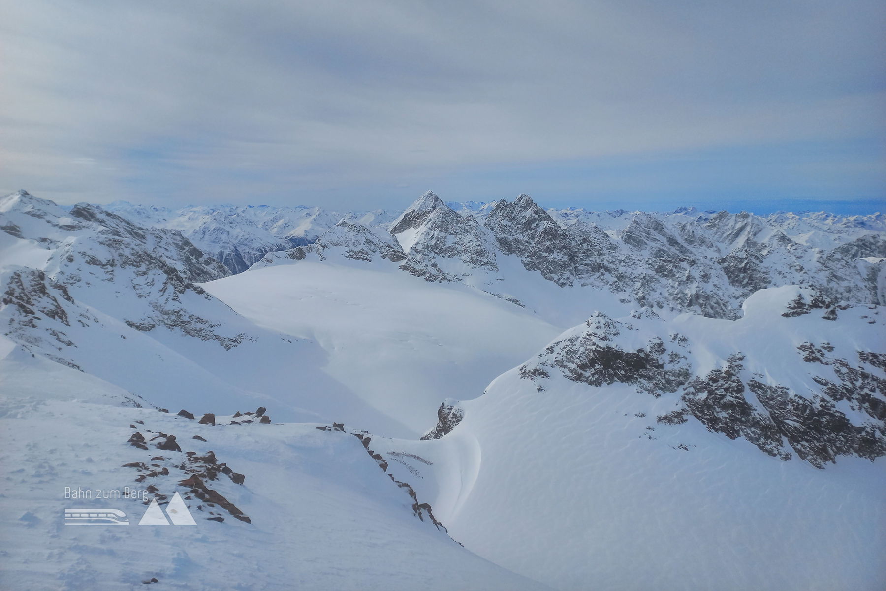 Dann sind wir auf 3.223 Meter – auf dem höchsten Gipfel, der zur Gänze in Vorarlberg liegt. Auch wenn sich rund 3 Stunden nach dem Aufbruch der Himmel mittlerweile etwas eingetrübt hat, ist das Panorama eindrucksvoll! Von den unmittelbaren Silvretta-Nachbarn stechen der Piz Buin und der Piz Linard hervor, auch das Silvretta- und das Verstanklahorn sind markant. Ansonsten fallen u.a. die Rote Wand im Lechquellengebirge, der Patteriol im Verwall, die Zimba im Rätikon und das „Zweigestirn“ Groß-Seehorn/Großlitzner auf der anderen Seite der Klostertaler Hütte auf. Im Hintergrund sind auch u.a. der Ortler und die Bernina zu sehen.