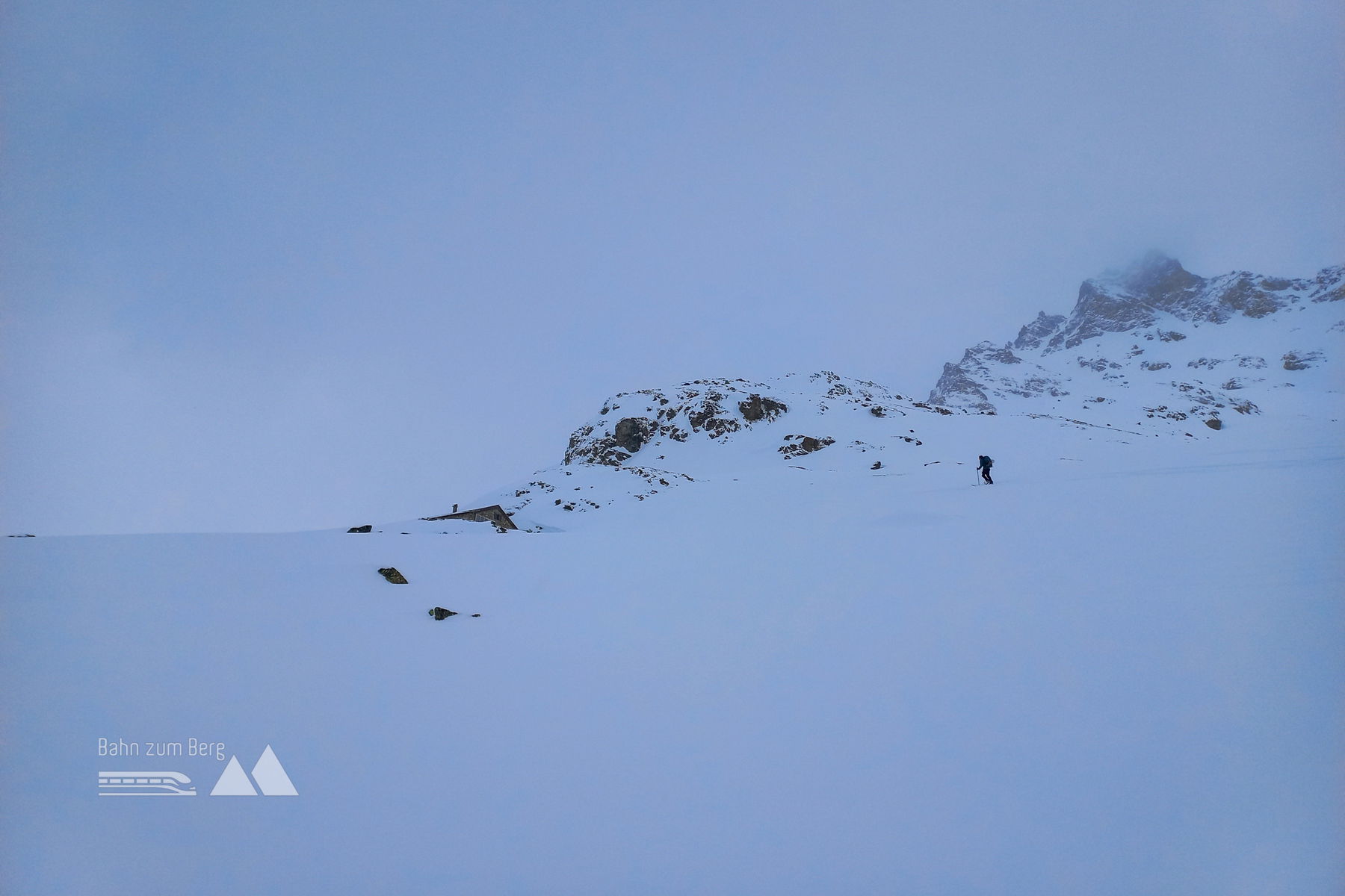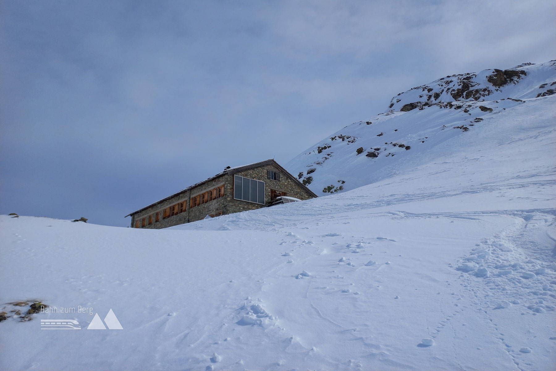 Das Gelände wird steiler, die Gegend anmutiger. Nicht zuletzt da wir auch ordentlich Verpflegung in den Rucksäcken haben, zieht sich der Aufstieg ganz schön in die Länge – und in die Schultern. Dazu kommt, dass der Schnee gewaltig an den Fellen anstollt. Nach knapp 5 Stunden erreichen wir dann glücklich unser Quartier auf 2.362 Meter.