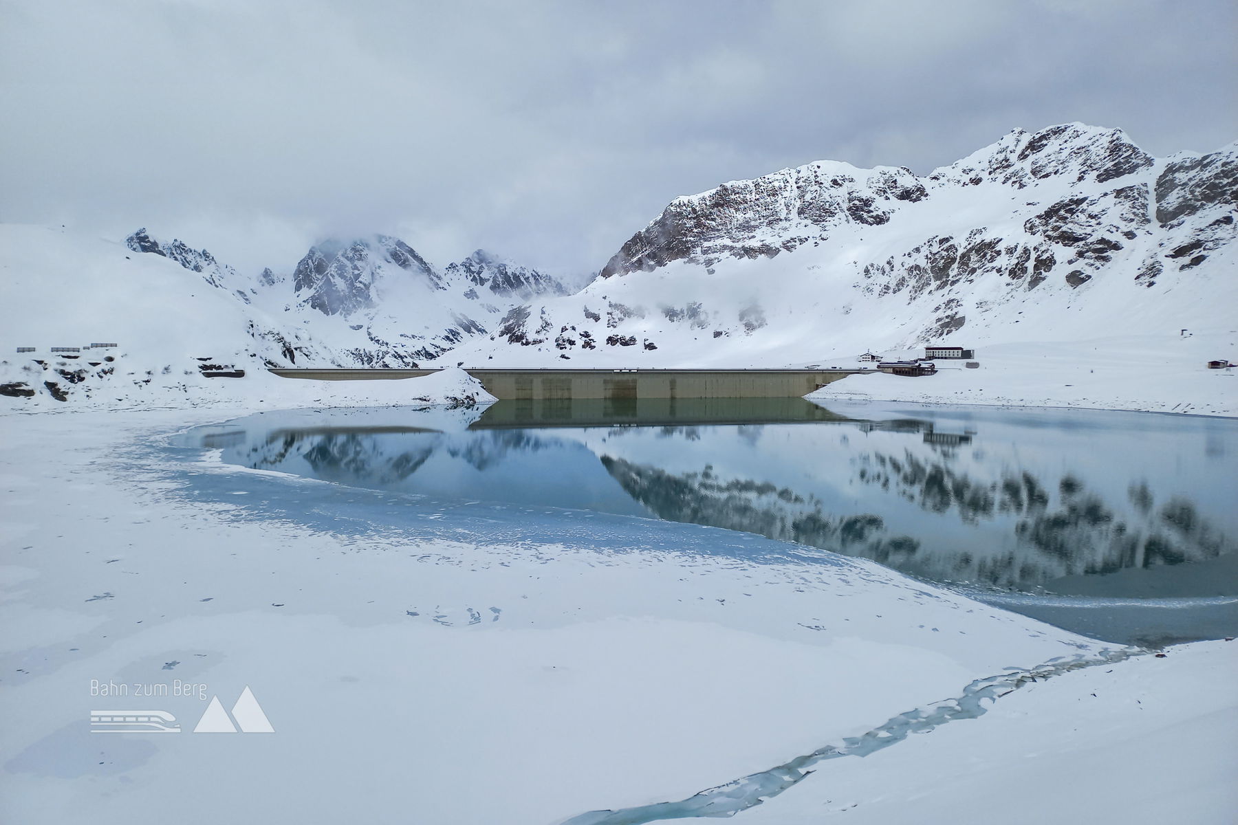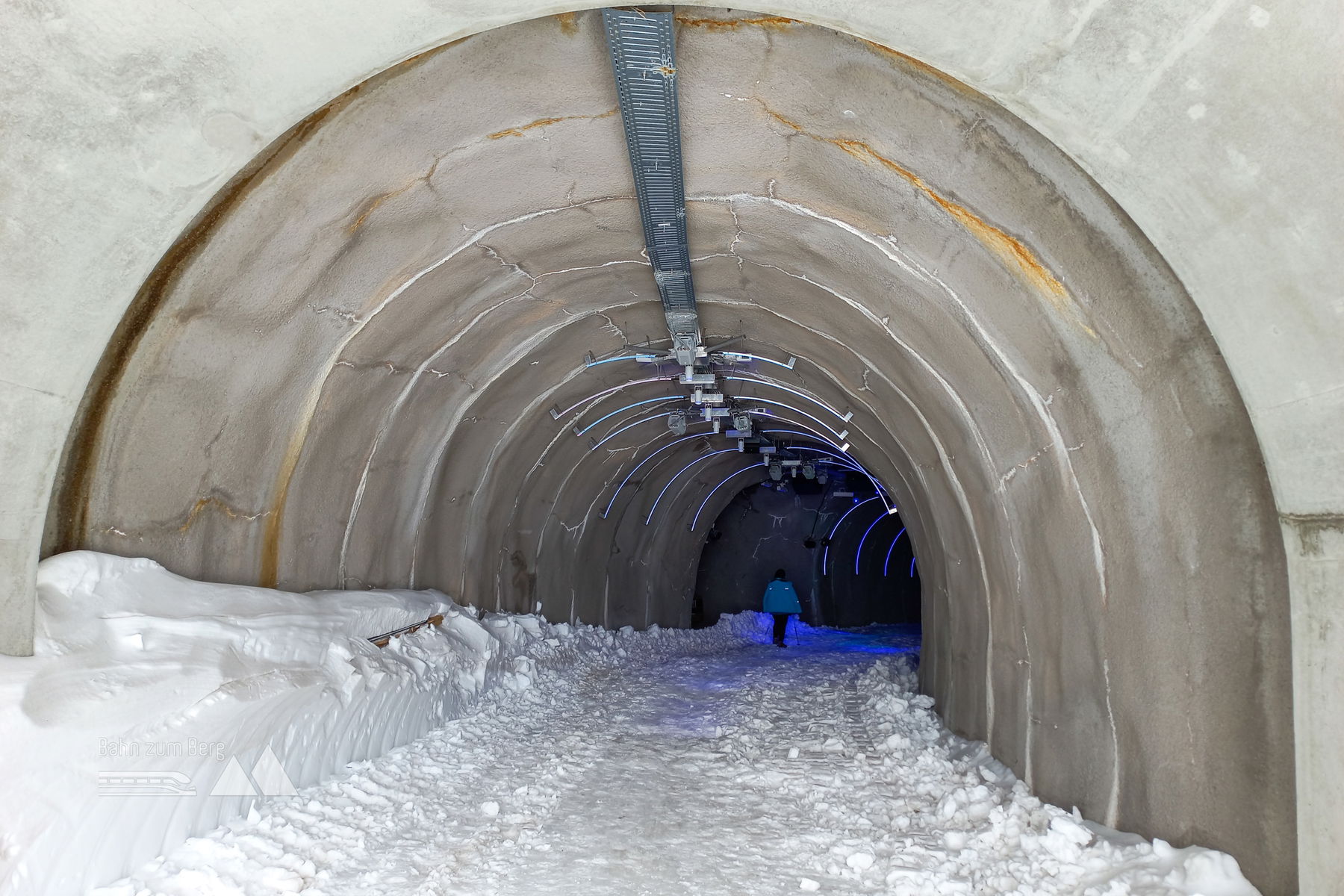 Im Gegensatz zum Aufstieg wählen wir beim Silvretta-Stausee aber nun die Westseite, da auf der Ostseite doch einiges an kleinen Gegenanstiegen zu erwarten wäre und westseitig auch eine Loipe gespurt ist. Ein kurzer Gegenanstieg bleibt uns aber auf der Westseite auch nicht erspart, und für den Tunnel vor der Staumauer (mit interessanter Licht- und Klang-Kunst-Installation!) und die Staumauer selbst müssen wir die Ski abschnallen.