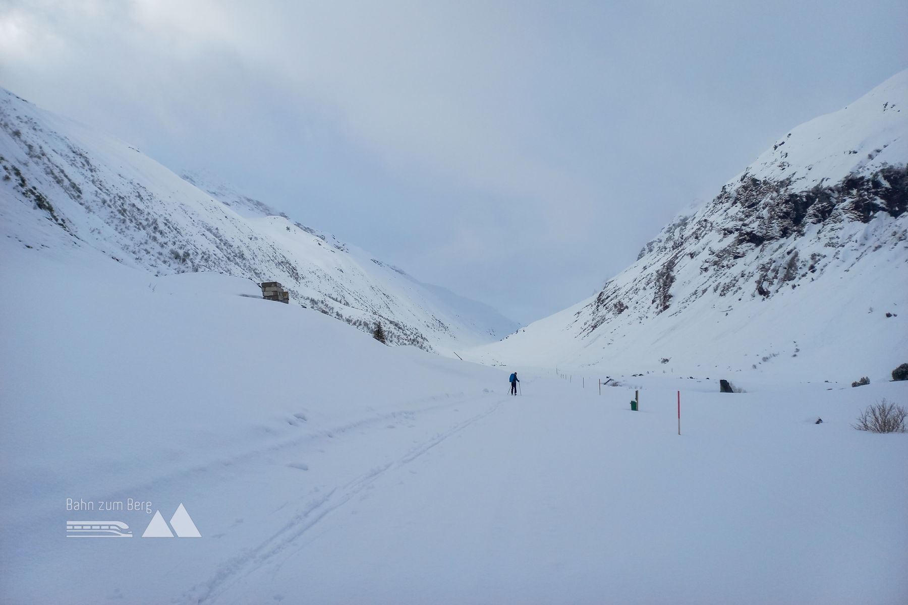 Los geht’s am Rande des Skigebiets Galtür auf 1.600 Meter Seehöhe Richtung Bieler Höhe, entlang der Silvretta Hochalpenstraße. Zunächst gibt es an diesem Tag leichten Schneeregen, der zum Glück aber allmählich weniger wird und mit zunehmender Höhe in Schnee übergeht (welcher uns am nächsten Tag noch sehr erfreuen wird!). Während es vom Montafon ja recht spektakulär auf die Bieler Höhe hinaufgeht, ist die Paznauntaler Seite sanft und weitläufig und es gibt sogar eine gespurte Langlaufloipe. Somit geht es am Anfang sehr gemächlich hinauf – die Stimmung, die von Landschaft, Wolken, Licht und Schnee ausgeht, ist angenehm anregend.