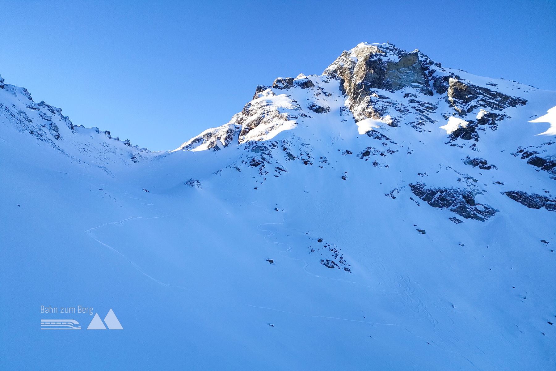 Nach dem Skidepot ist für die ersten Schwünge Vorsicht geboten, dann geht es flott traversierend zum Plattenjoch und von dort über die Direttissima zur Hütte. Die Schneeverhältnisse waren sehr durchwachsen, aber wenn es da einen feinen Pulverschnee hat, muss diese nordseitige Abfahrt vom Plattenjoch ein unglaublicher Genuss sein.