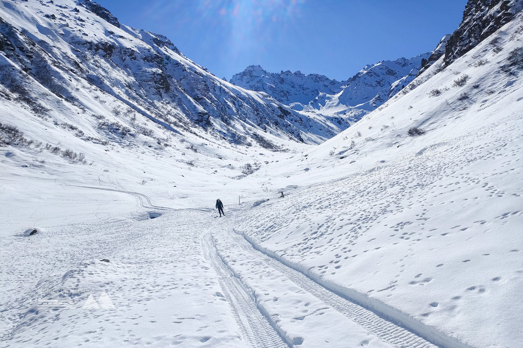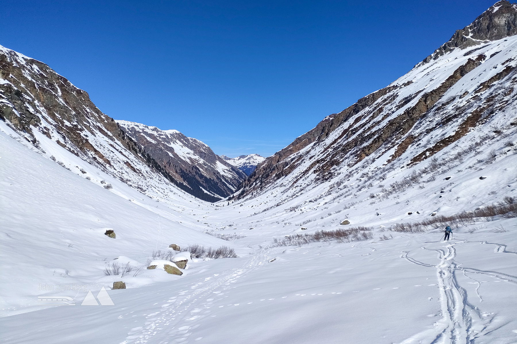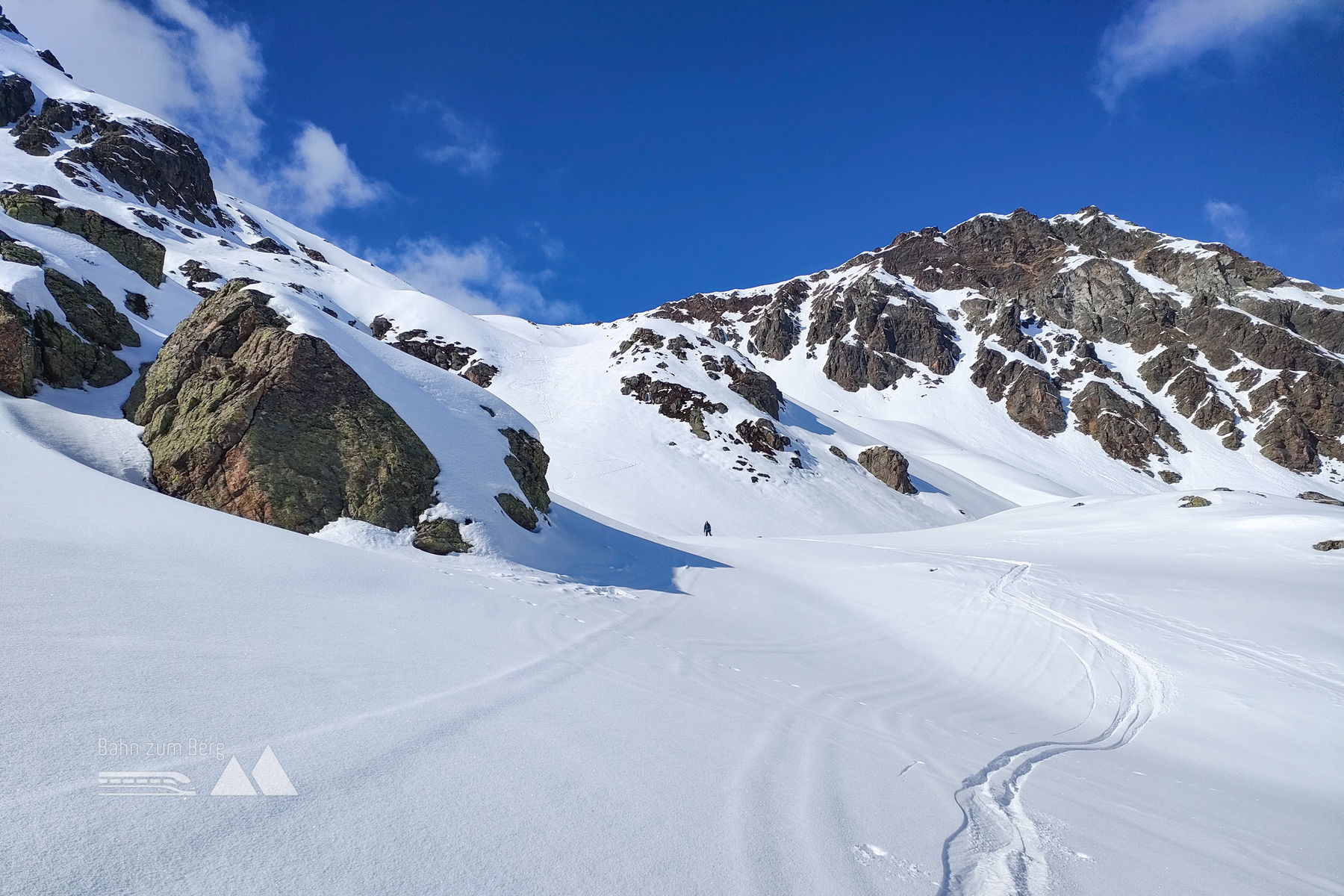Der Talboden ist rasch erreicht, wo wir uns dann durch eine Schnee-/Steinlandschaft etwas durchwühlen. Spuren erleichtern uns aber die Wegfindung. Zum Schluss ist dann etwas Gegenanstieg vonnöten, den wir aber im „Langlaufstil“ ohne Auffellen bewältigen.